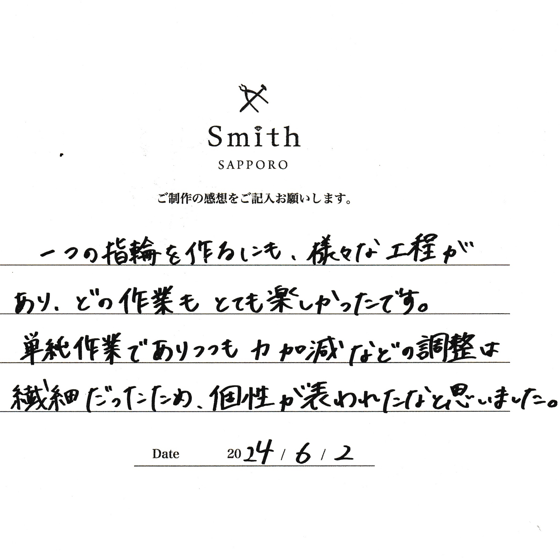 この度は、工房Smith京王プラザホテル札幌店で手作りペアリングのご制作誠にありがとうございました。