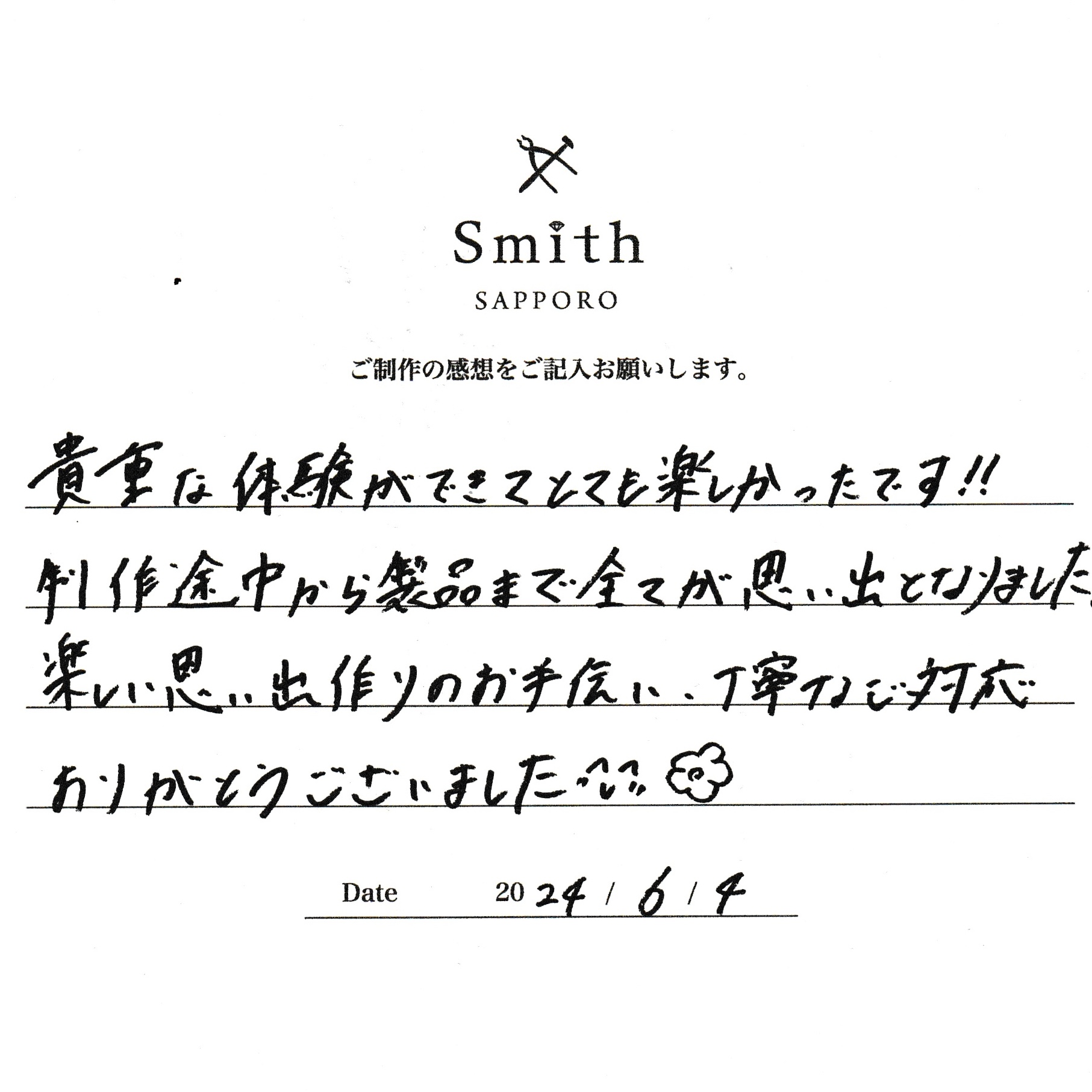 この度は、工房Smith京王プラザホテル札幌店で手作りペアリングのご制作誠にありがとうございました。