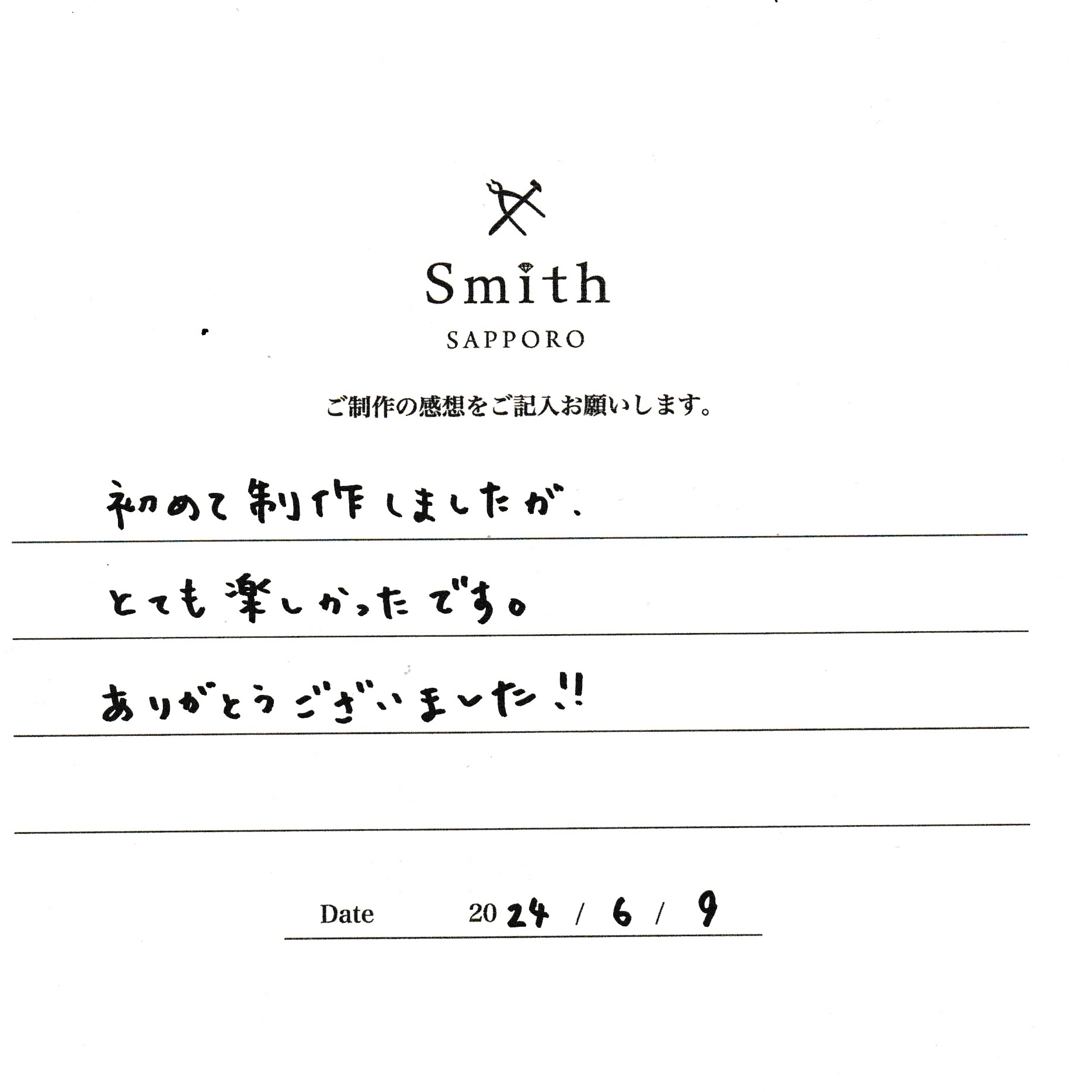 この度は、工房Smith京王プラザホテル札幌店で手作りペアリングのご制作誠にありがとうございました。