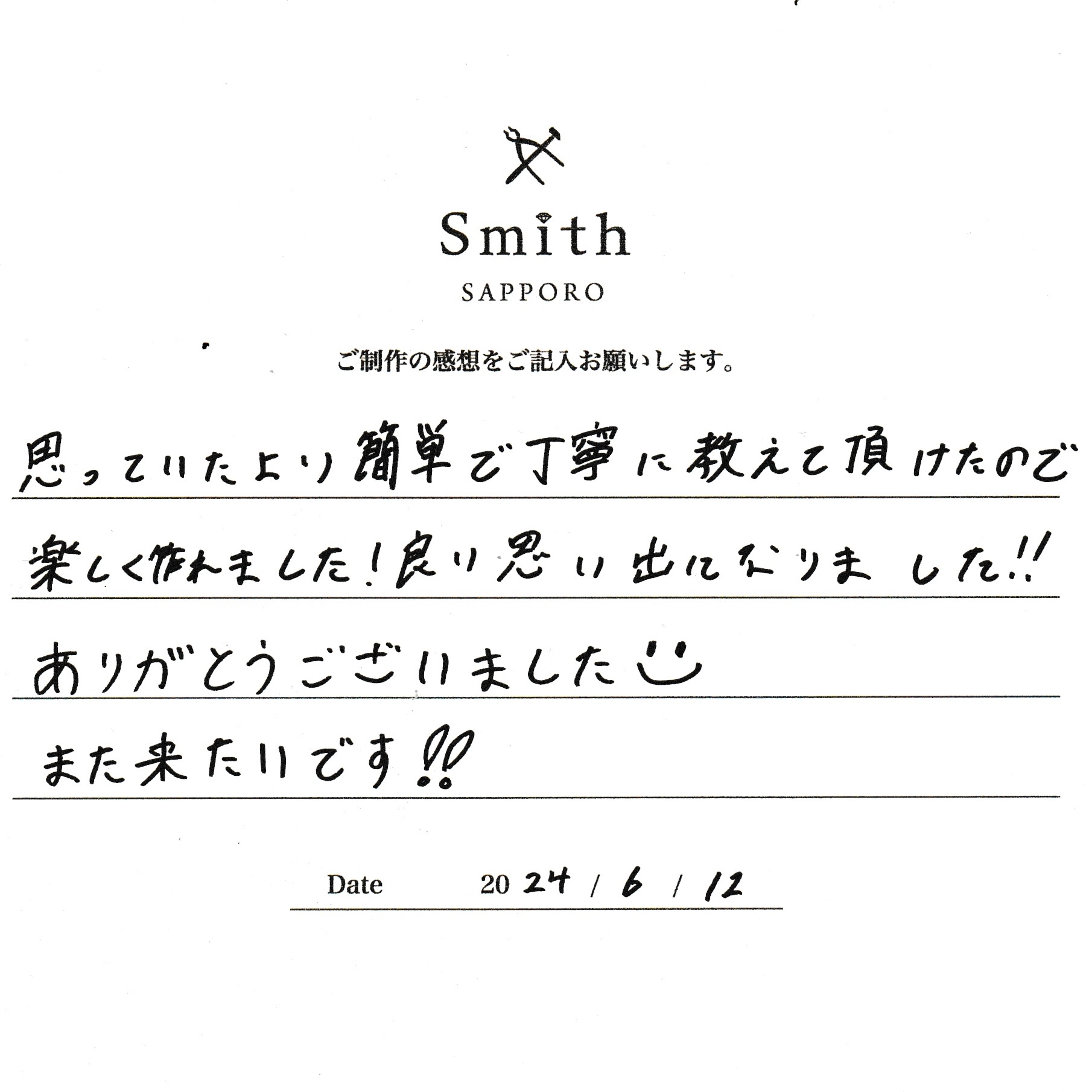 この度は、工房Smith京王プラザホテル札幌店で手作りペアリングのご制作誠にありがとうございました。