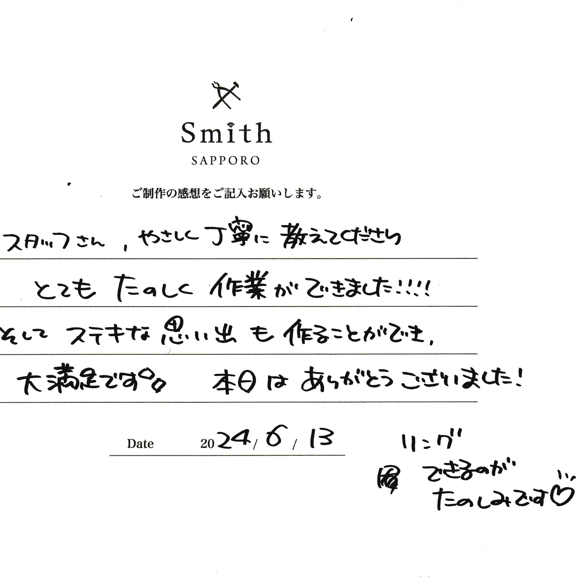 この度は、工房Smith京王プラザホテル札幌店で手作りペアリングのご制作誠にありがとうございました。