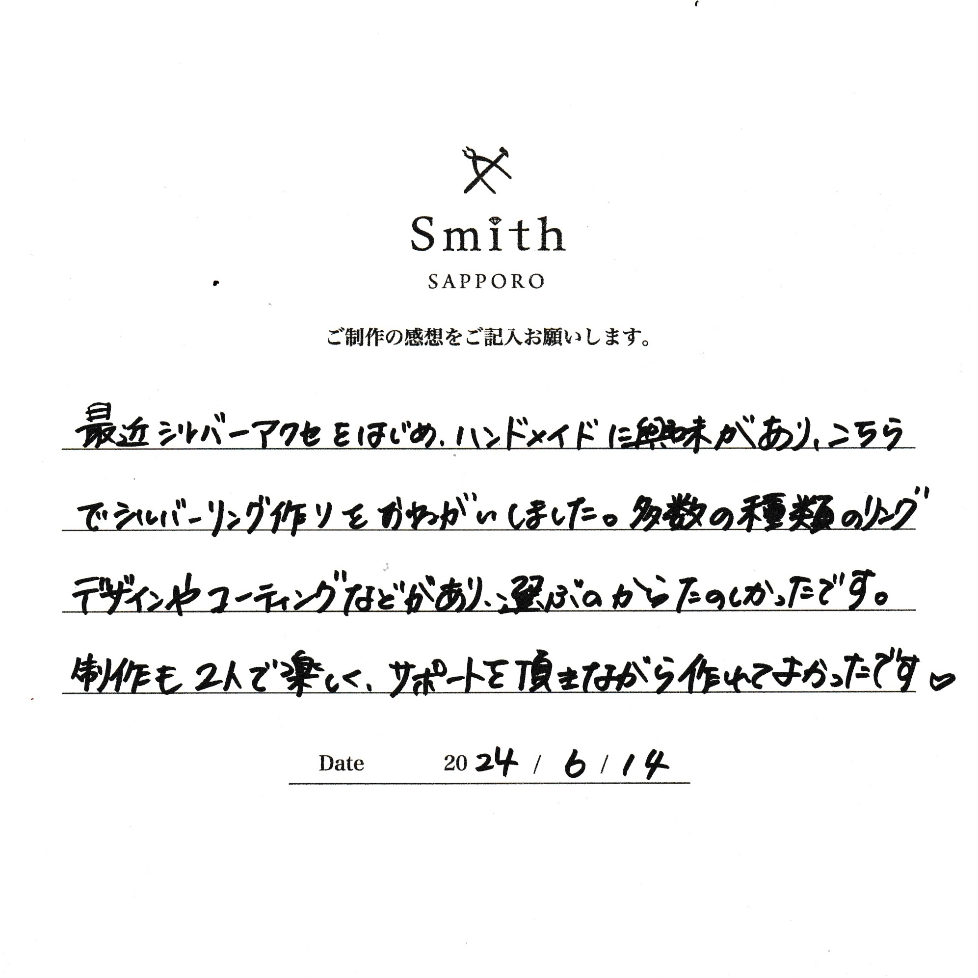 この度は、工房Smith京王プラザホテル札幌店で手作りペアリングのご制作誠にありがとうございました。