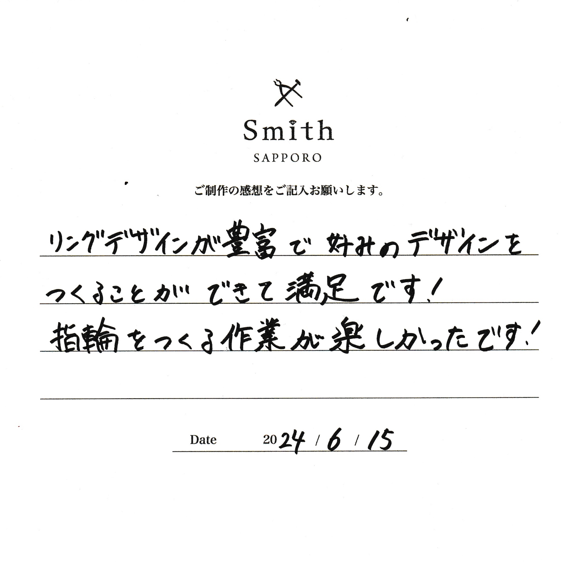 この度は、工房Smith京王プラザホテル札幌店で手作りペアリングのご制作誠にありがとうございました。