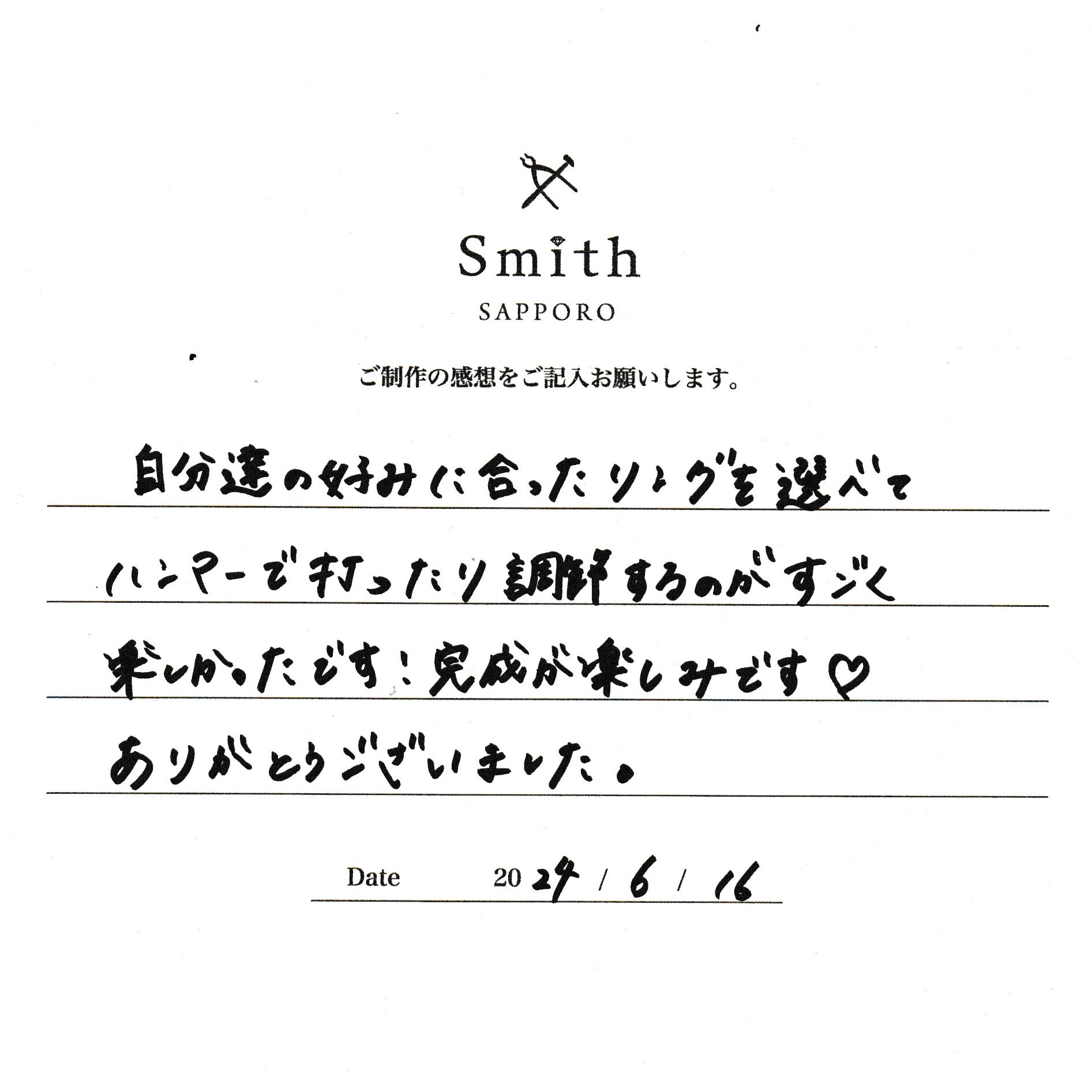この度は、工房Smith京王プラザホテル札幌店で 手作りペアリングのご制作 誠にありがとうございました。