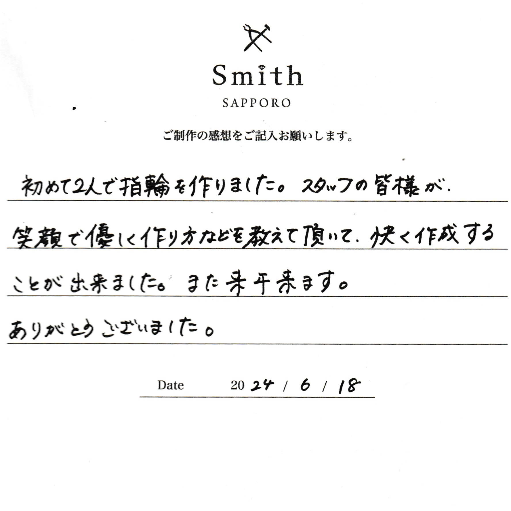 この度は、工房Smith京王プラザホテル札幌店で手作りペアリングのご制作誠にありがとうございました。