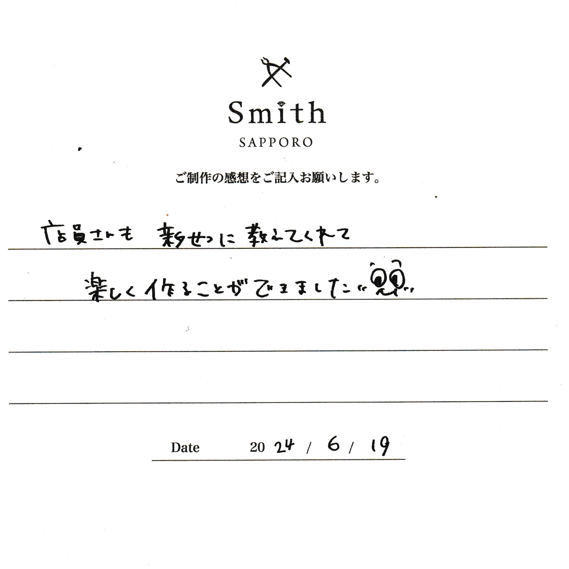 この度は、工房Smith京王プラザホテル札幌店で手作りペアリングのご制作誠にありがとうございました。