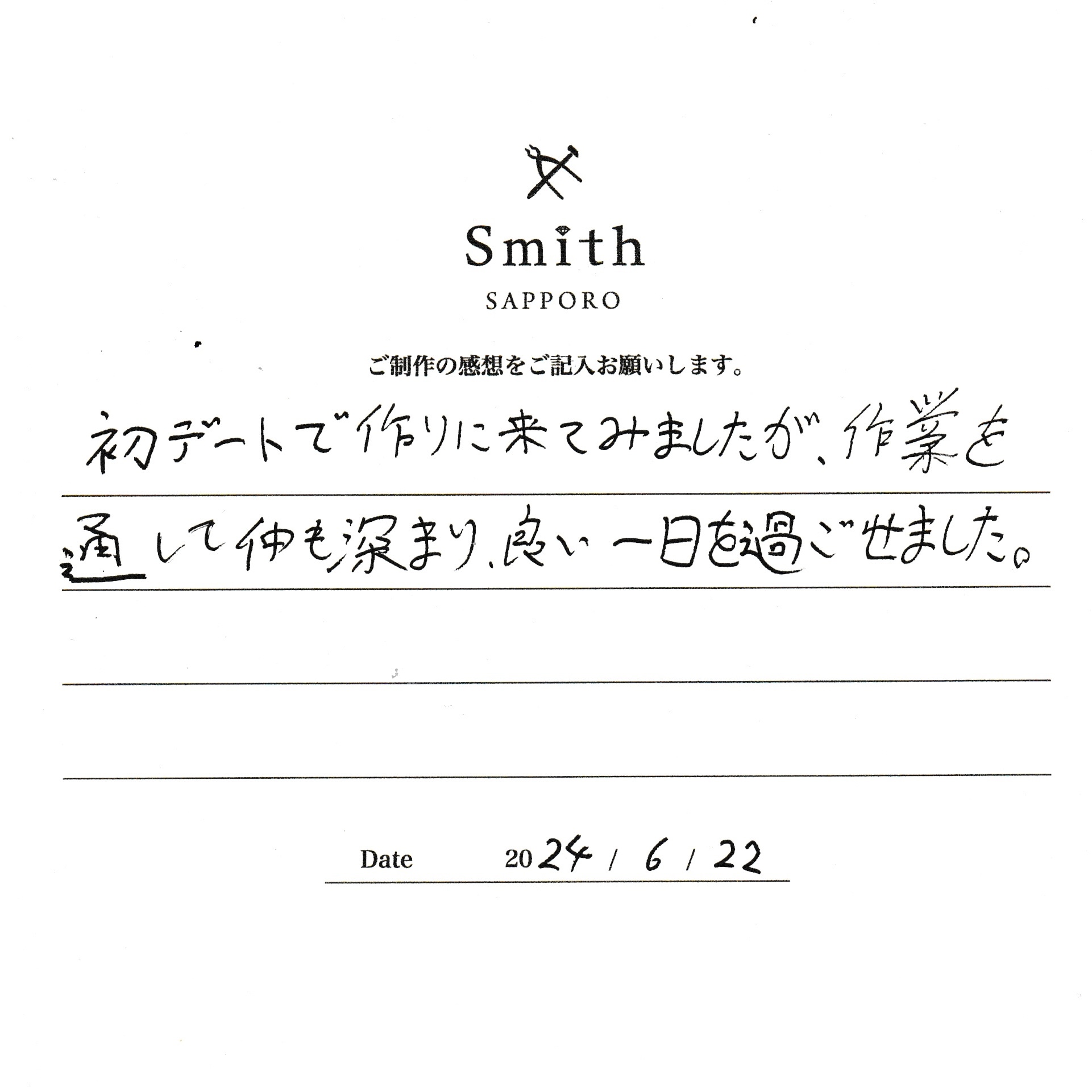 この度は、工房Smith京王プラザホテル札幌店で手作りペアリングのご制作誠にありがとうございました。