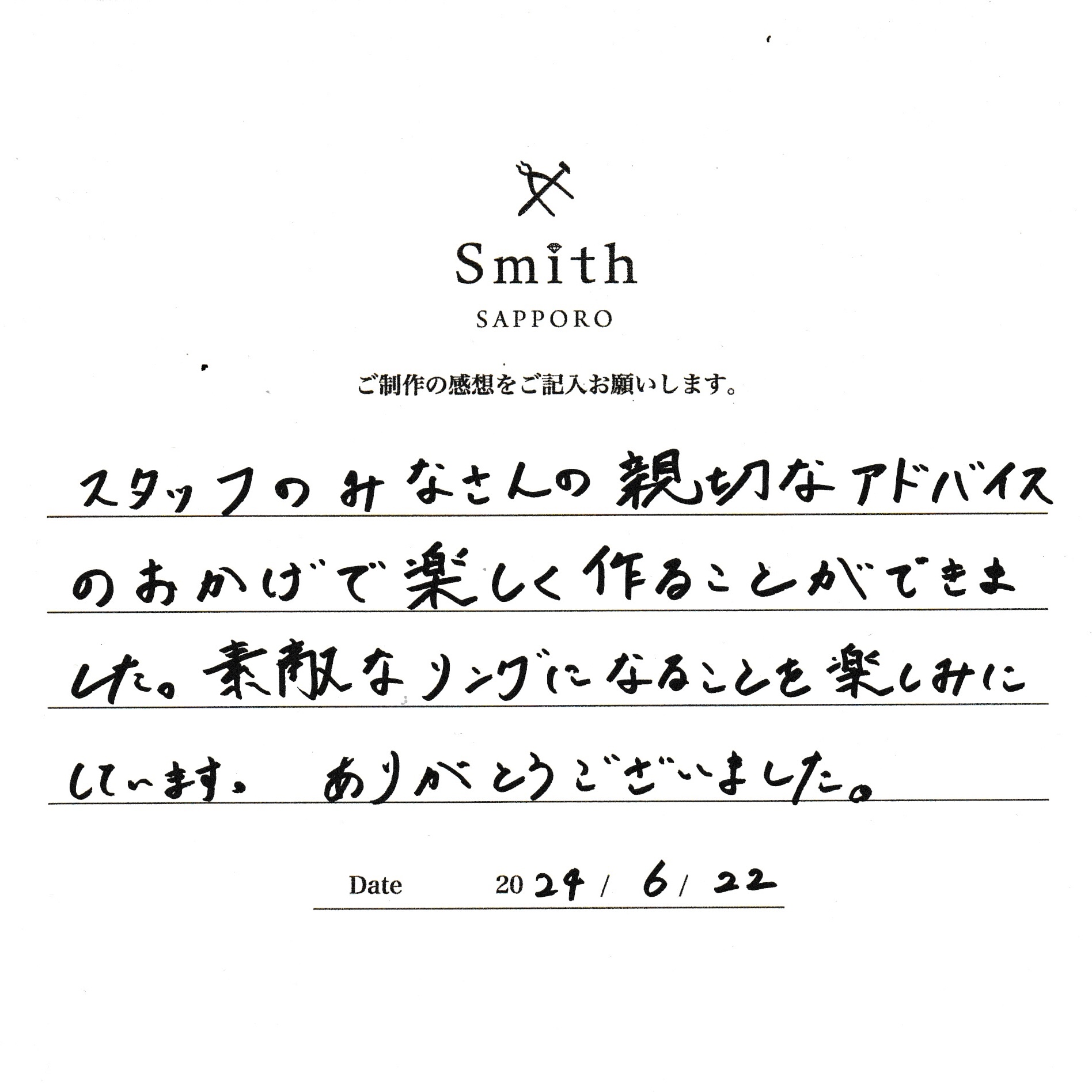 この度は、工房Smith京王プラザホテル札幌店で手作りペアリングのご制作誠にありがとうございました。