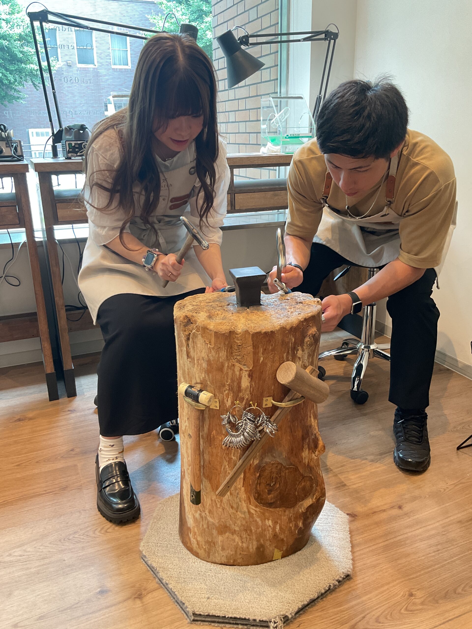 おふたりの手でハンマー模様をつけたリングにシャンパンゴールドとイエローゴールドの色違いのコーティングを施し、素敵なデザインのリングになりましたね。