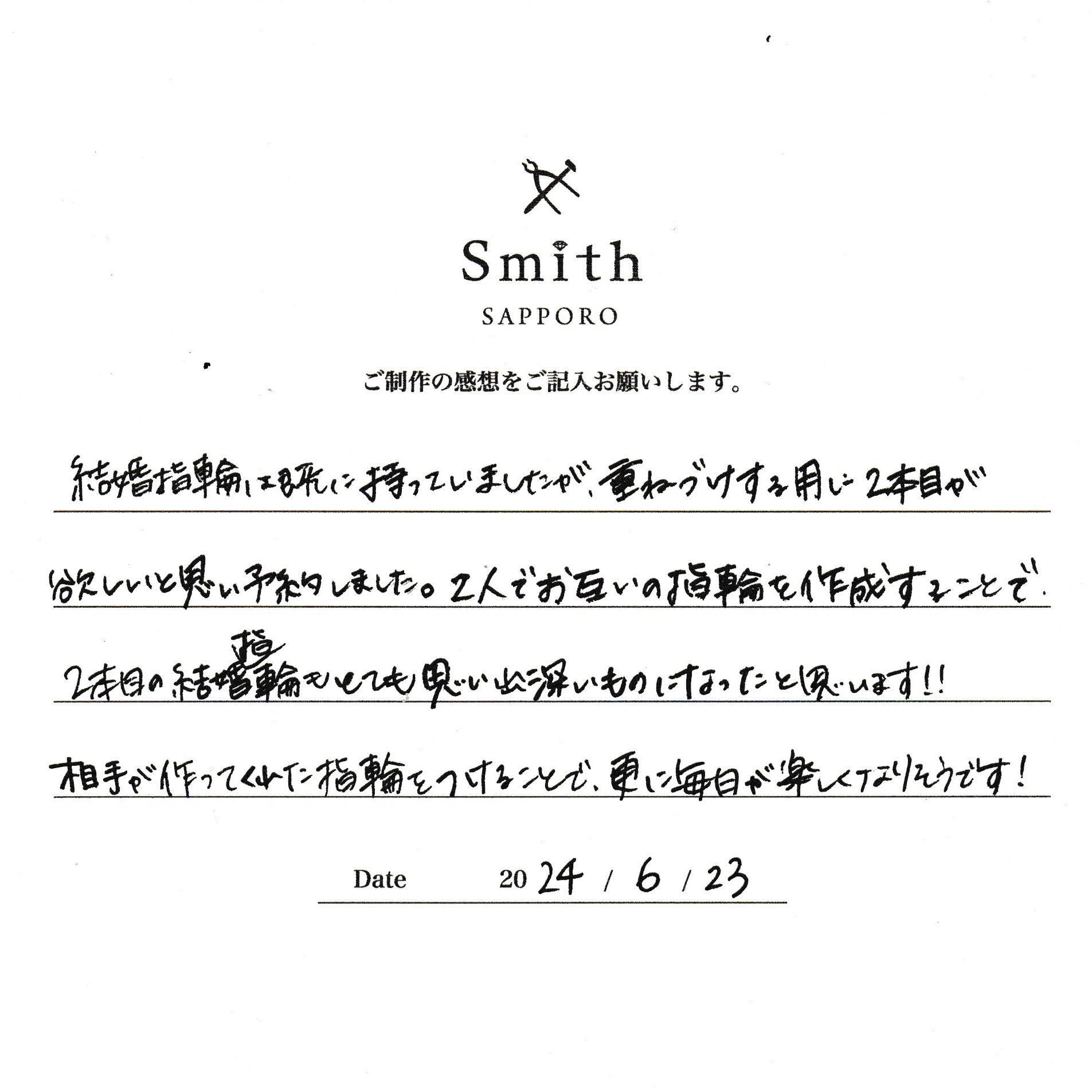 この度は、工房Smith京王プラザホテル札幌店で手作りペアリングのご制作 誠にありがとうございました。