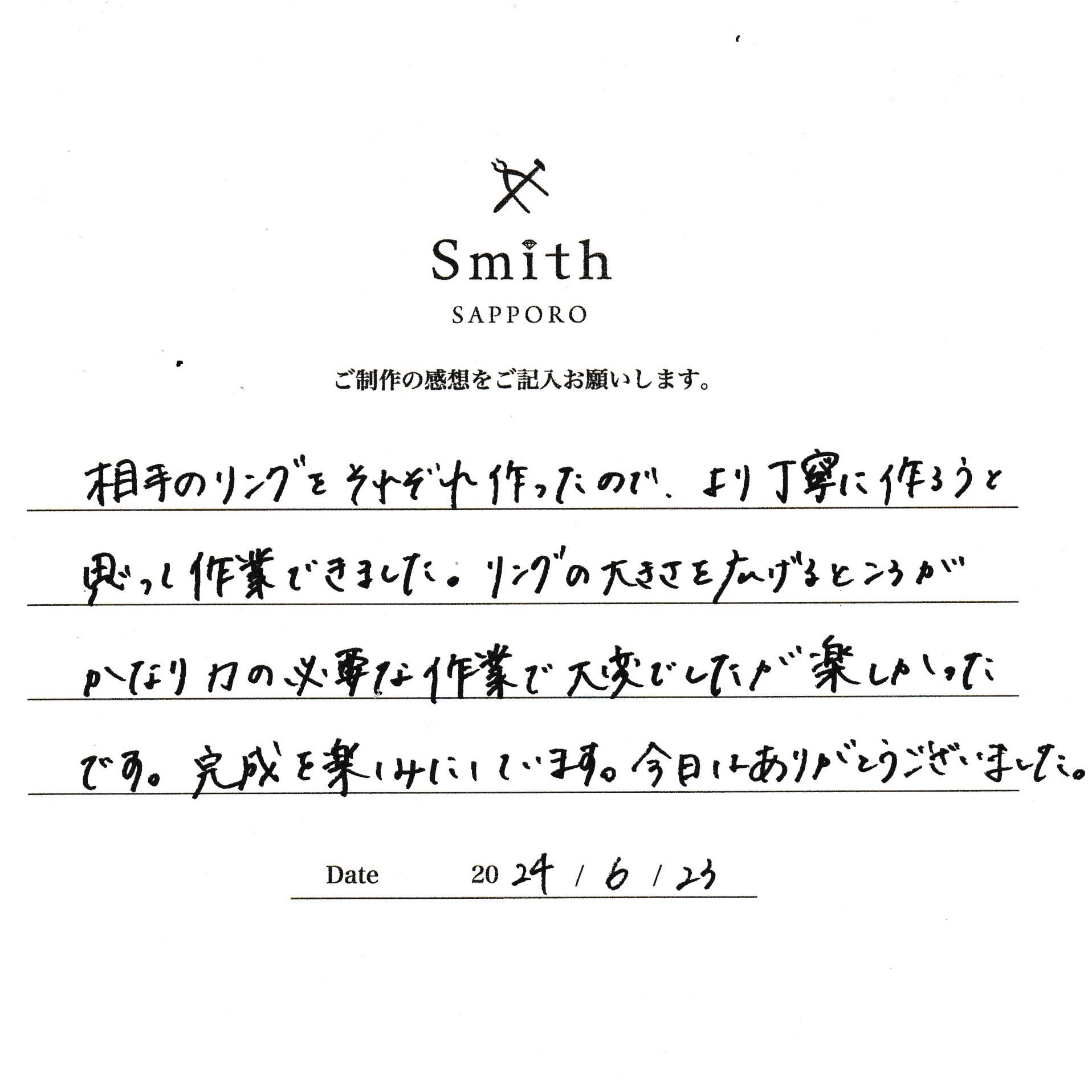 この度は、工房Smith京王プラザホテル札幌店で手作りペアリングのご制作誠にありがとうございました。