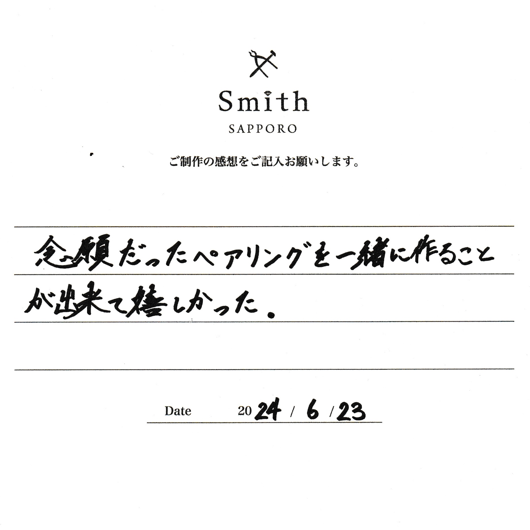この度は、工房Smith京王プラザホテル札幌店で手作りペアリングのご制作誠にありがとうございました。