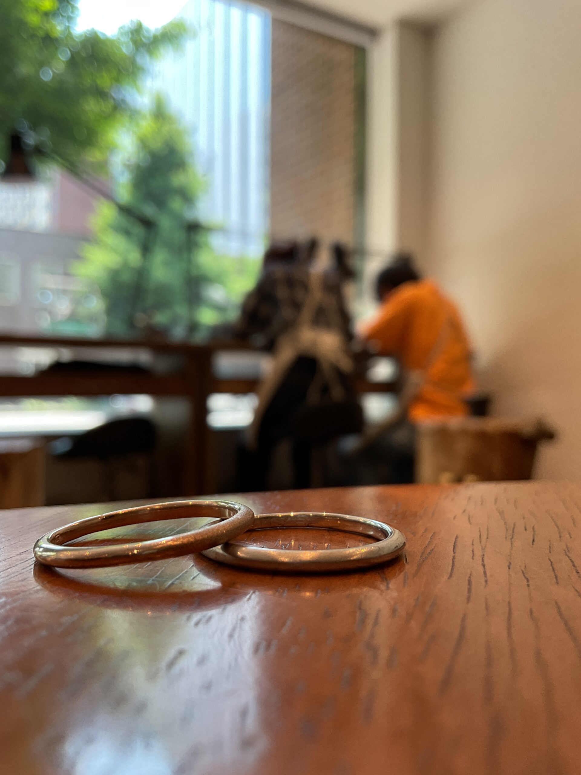 お二人で幅広の5mmリングをお揃いにし、内側にはお付き合いされた記念日の日付が刻印されました。