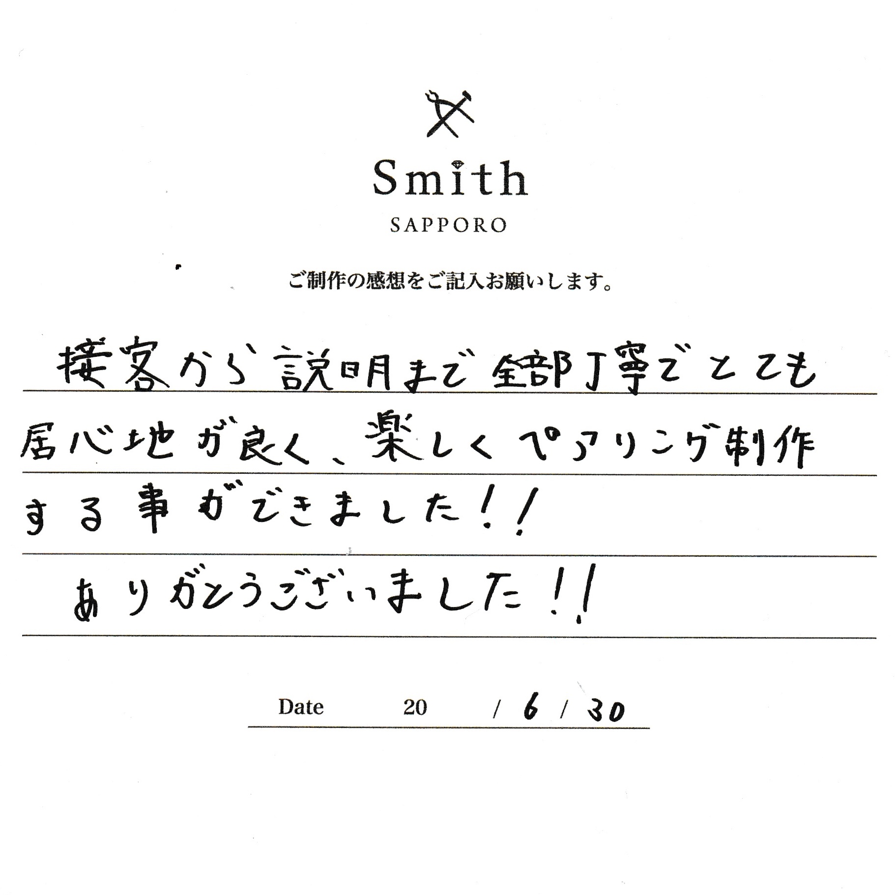 この度は、工房Smith京王プラザホテル札幌店で手作りペアリングのご制作誠にありがとうございました。