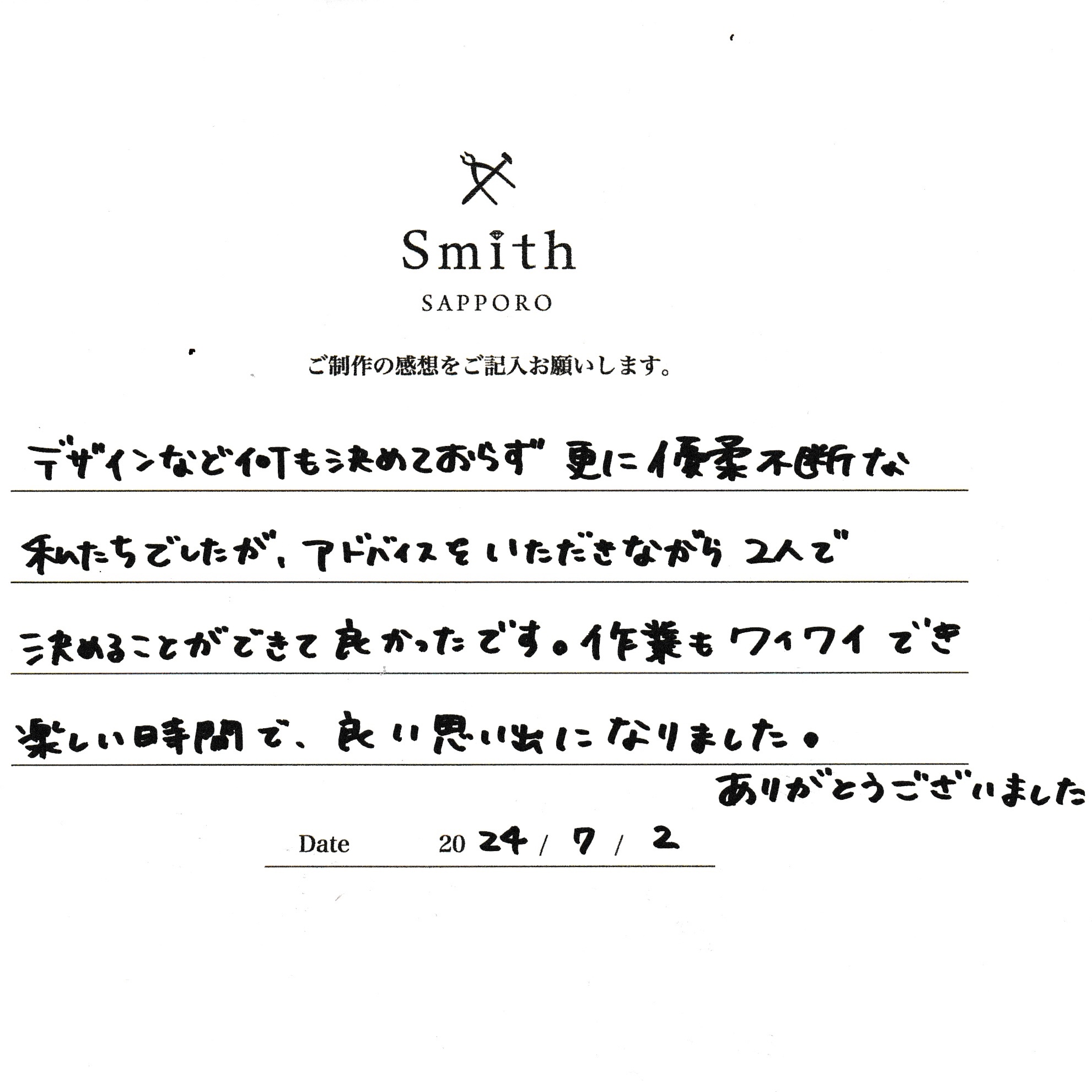 この度は、工房Smith京王プラザホテル札幌店で手作りペアリングのご制作