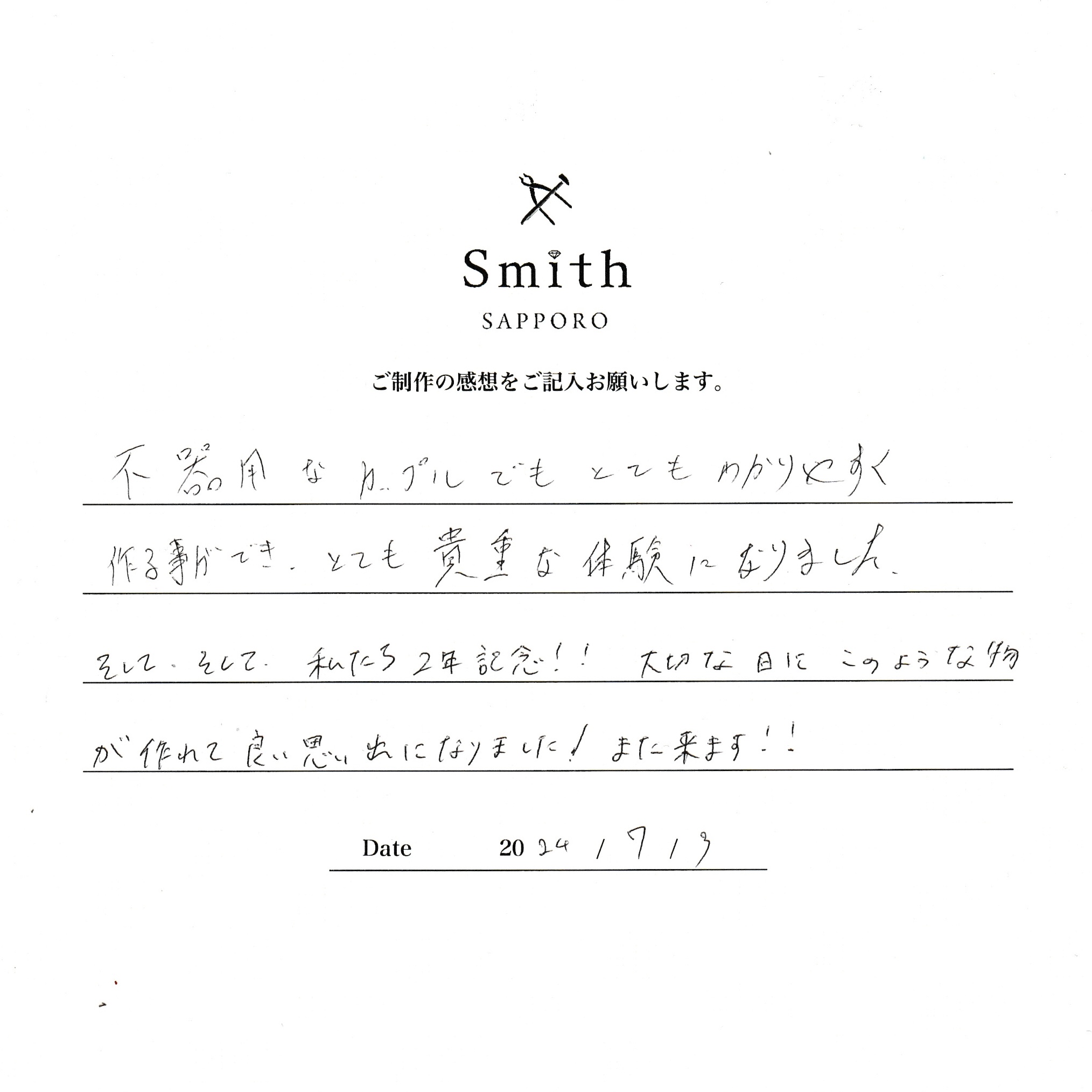 この度は、工房Smith札幌本店にお越しいただき誠にありがとうございました。