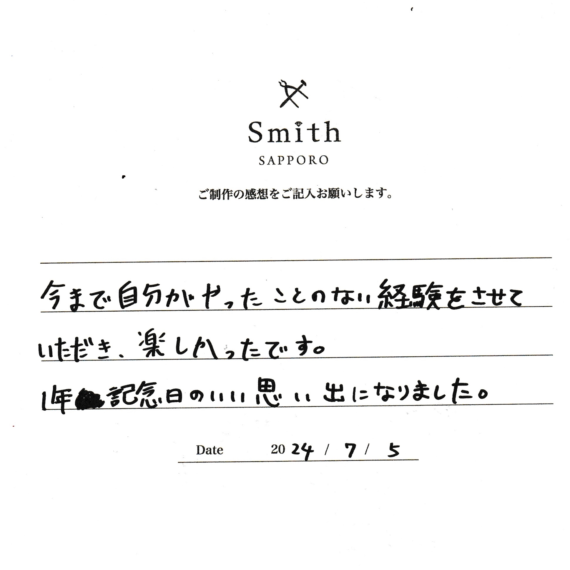 この度は、工房Smith京王プラザホテル札幌店で手作りペアリングのご制作誠にありがとうございました。