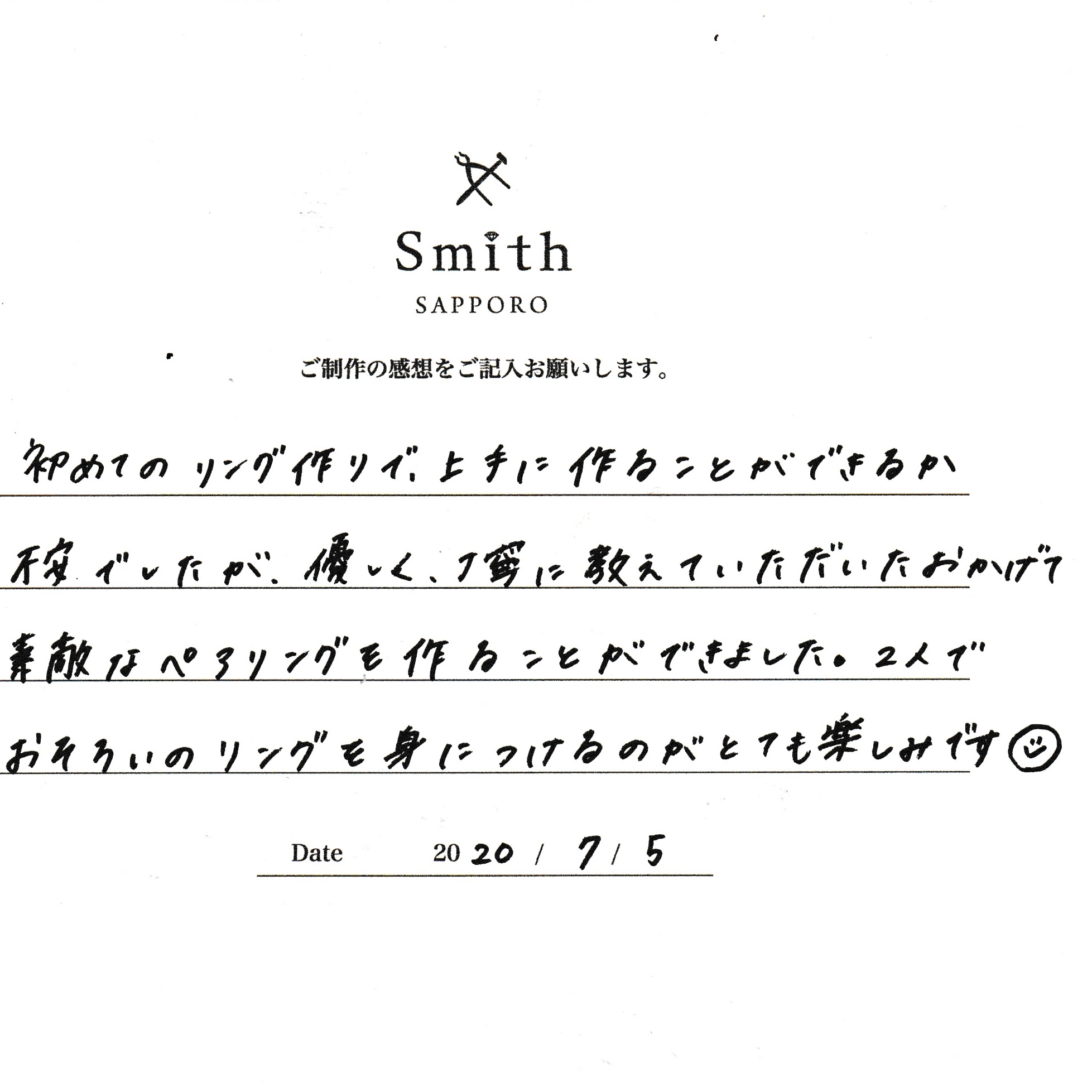 この度は、工房Smith京王プラザホテル札幌店で手作りペアリングのご制作誠にありがとうございました。またのご来店をスタッフ一同、心よりお待ちしております。