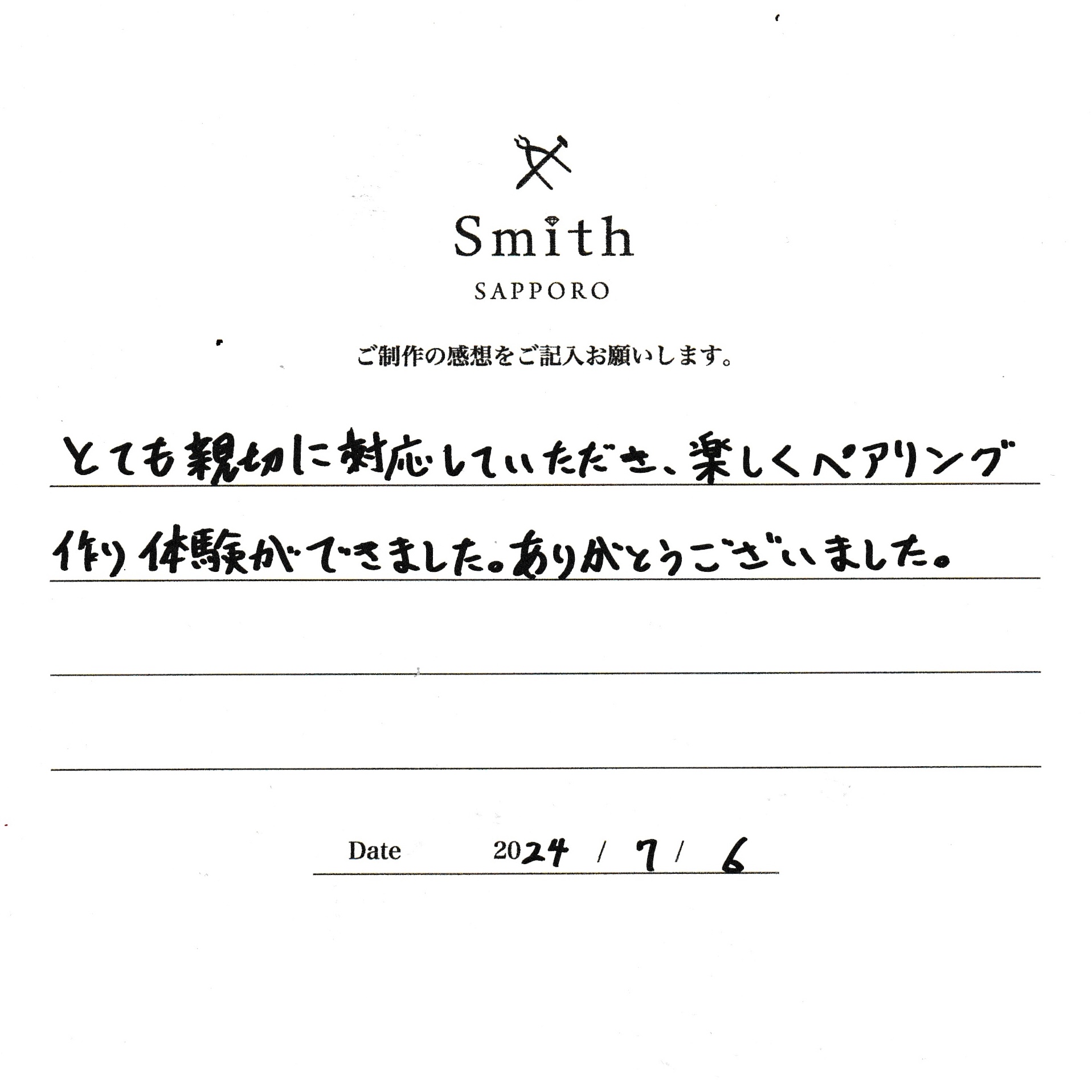 この度は、工房Smith京王プラザホテル札幌店で手作りペアリングのご制作誠にありがとうございました。