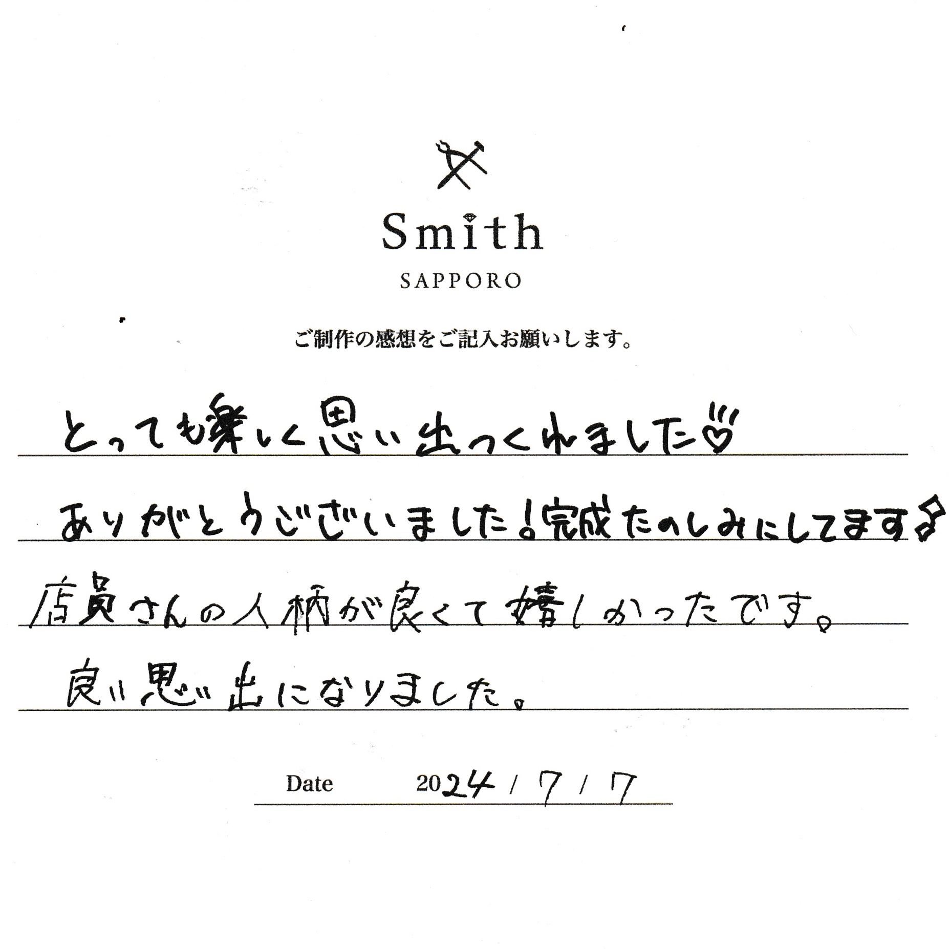 この度は、工房Smith京王プラザホテル札幌店で手作りペアリングのご制作誠にありがとうございました。