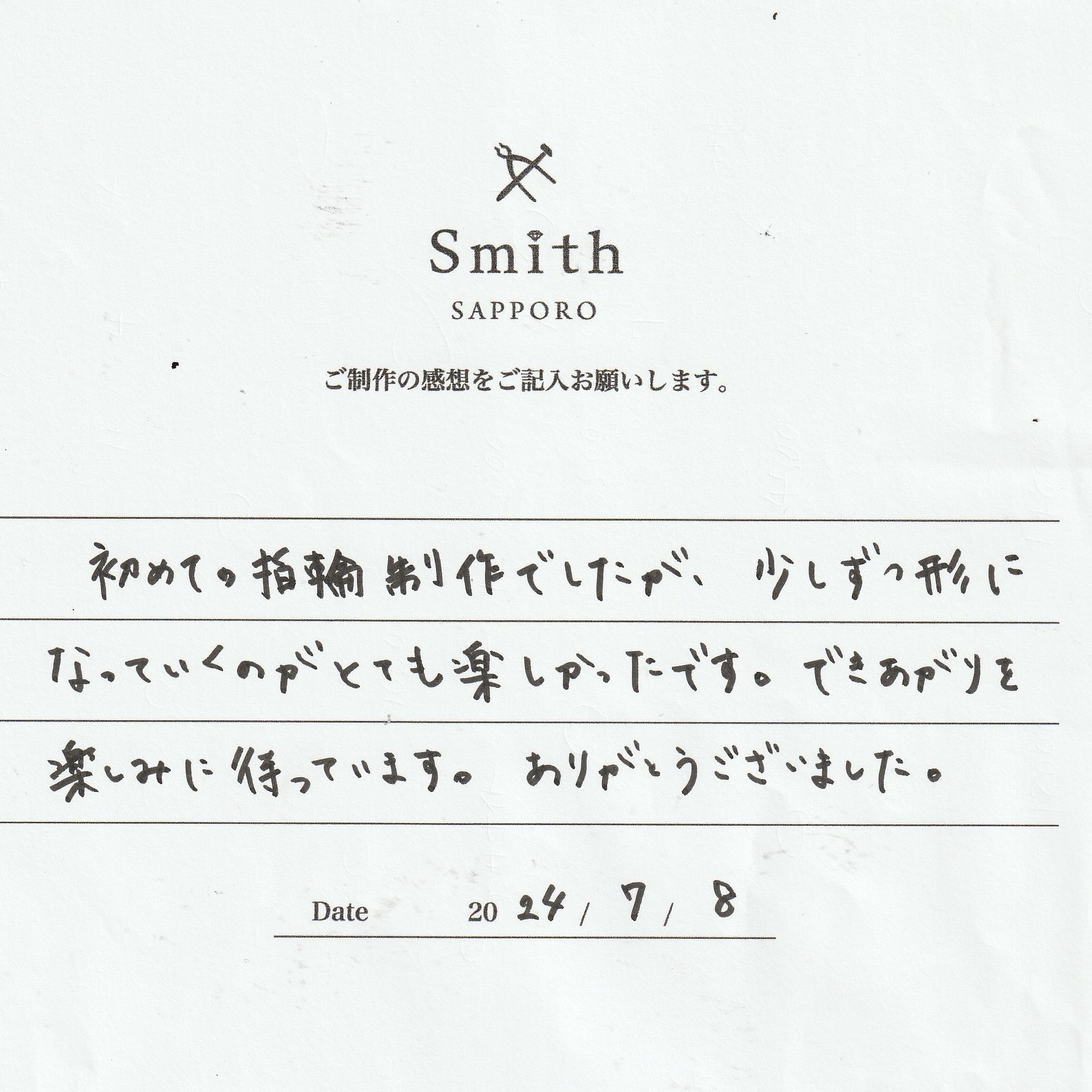 この度は、工房Smith京王プラザホテル札幌店で手作りペアリングのご制作誠にありがとうございました。