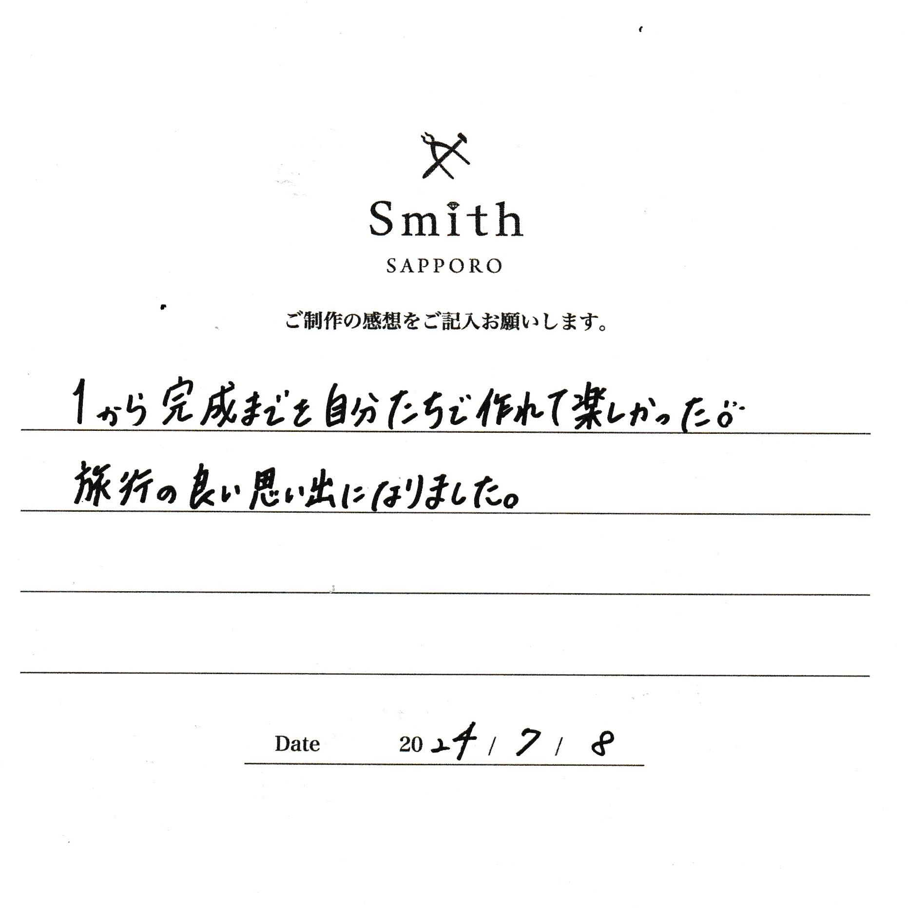 この度は、工房Smith京王プラザホテル札幌店で手作りペアリングのご制作誠にありがとうございました。