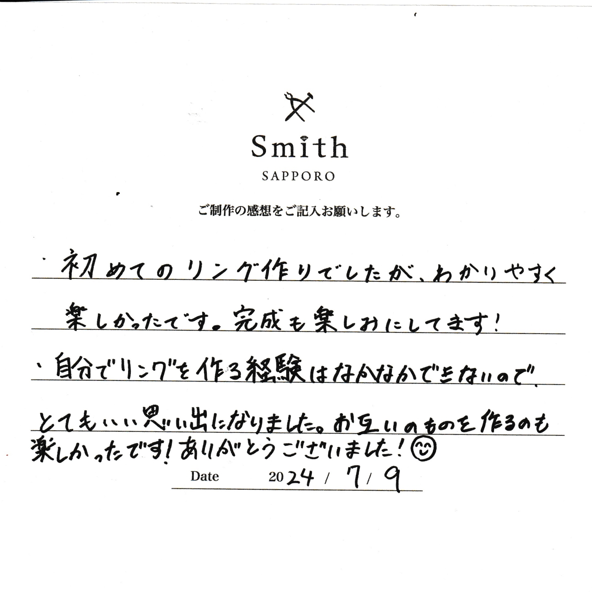 この度は、工房Smith京王プラザホテル札幌店で手作りペアリングのご制作誠にありがとうございました。