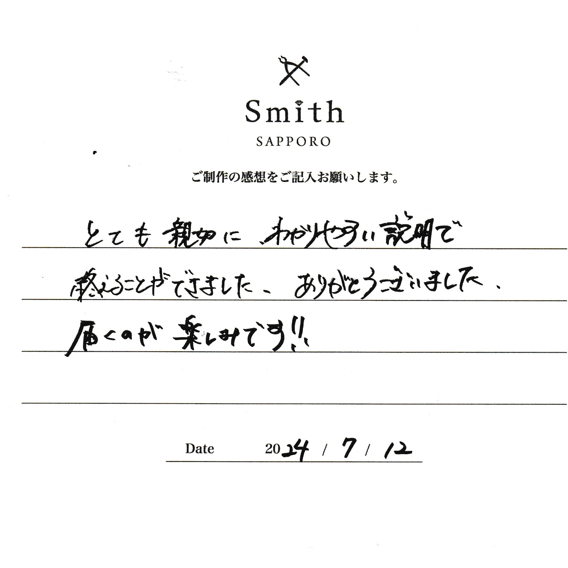 この度は、工房Smith京王プラザホテル札幌店で手作りペアリングのご制作誠にありがとうございました。