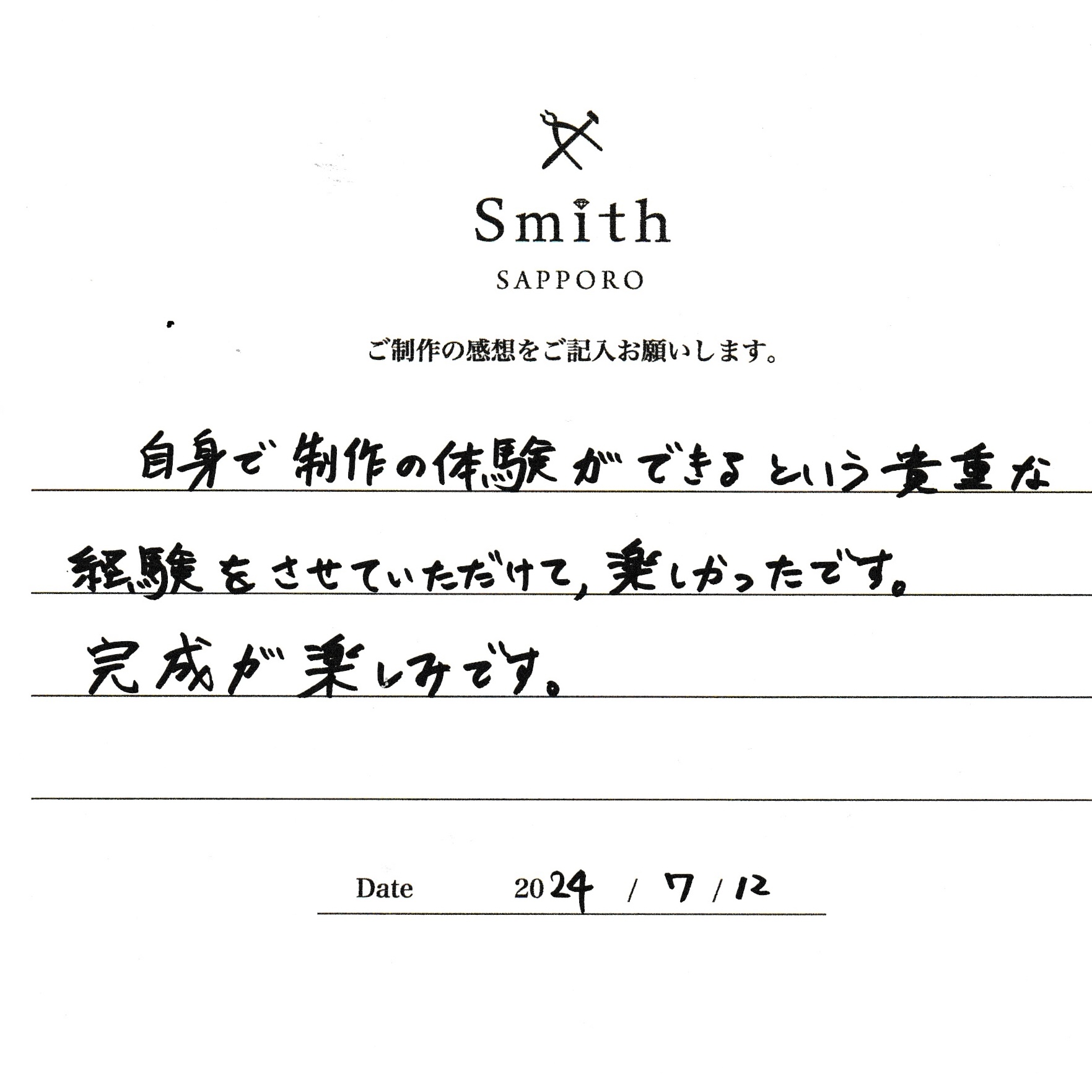この度は、工房Smith京王プラザホテル札幌店で手作りペアリングのご制作誠にありがとうございました。