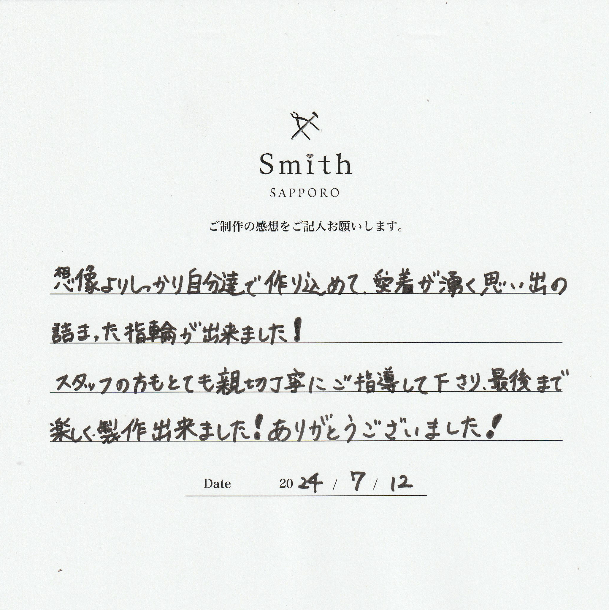 丁寧にお作りいただきました指輪が、お二人とご家族の絆をさらに深めてくれますよう祈っております。
