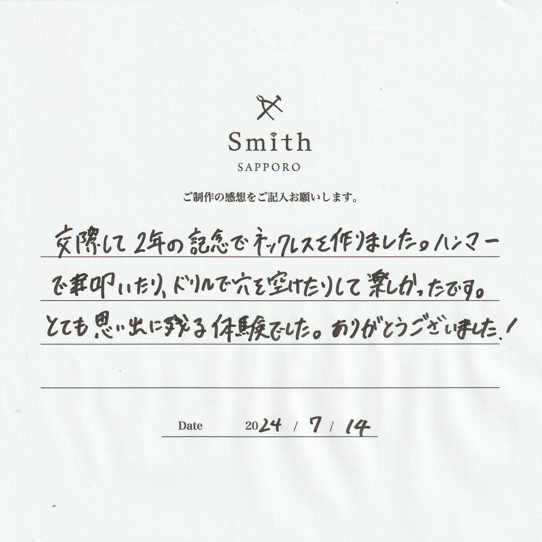 この度はお二人にとっての大切な記念に、手作りのペアネックレスをご制作いただきまして誠にありがとございます。