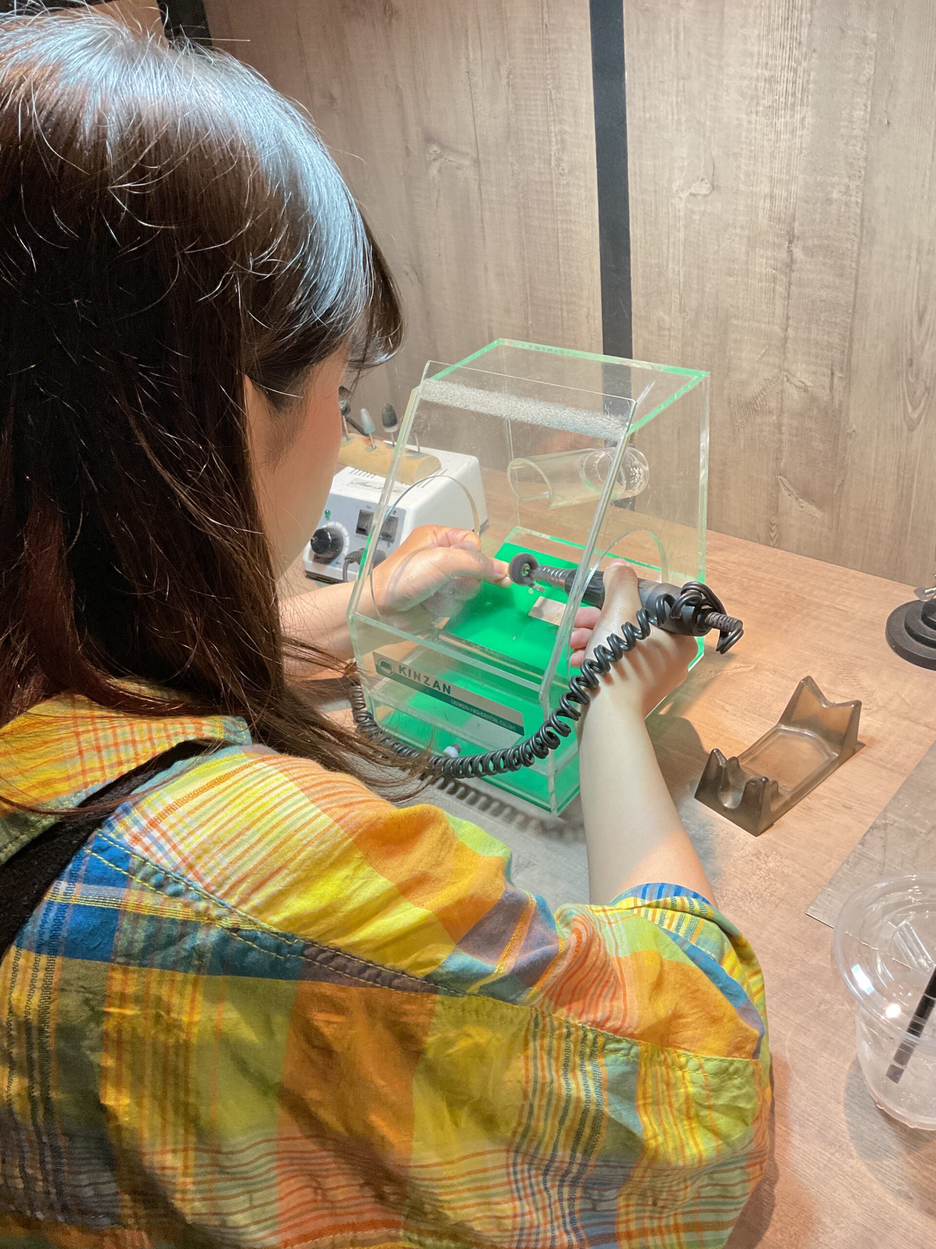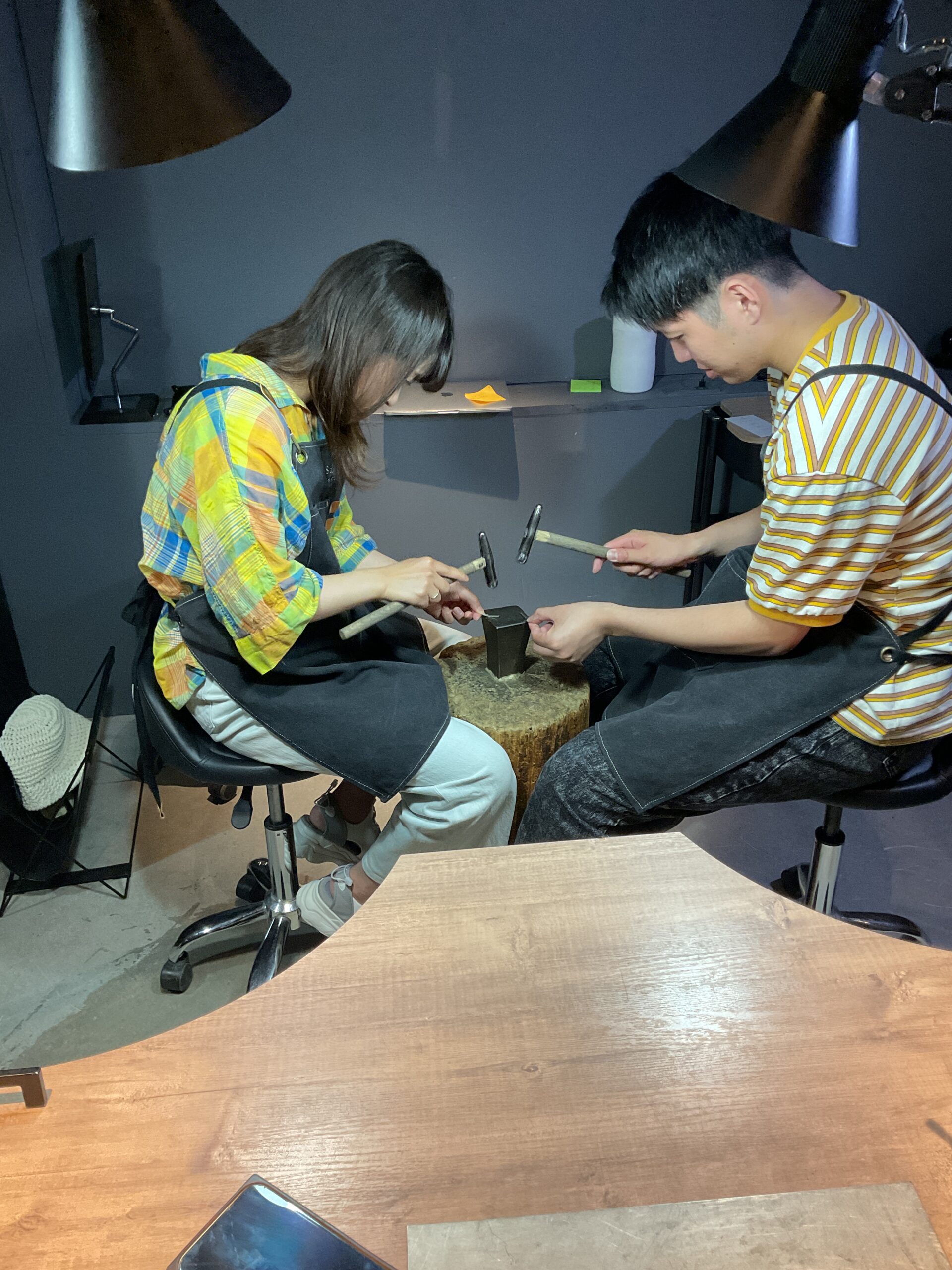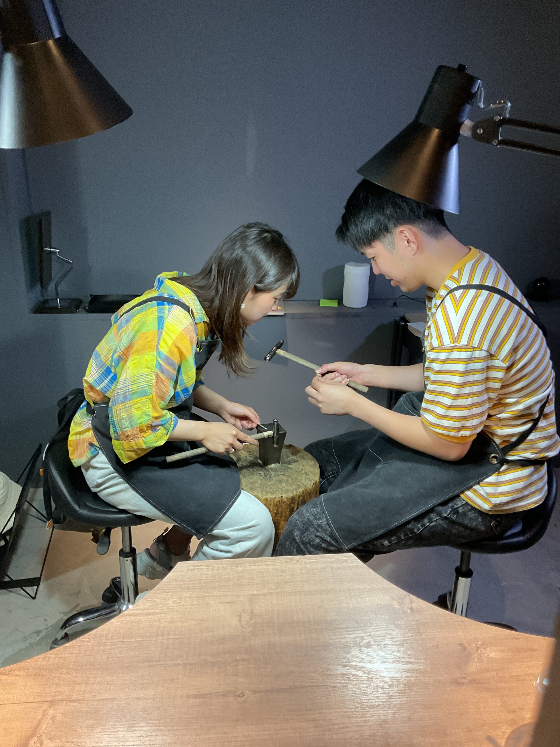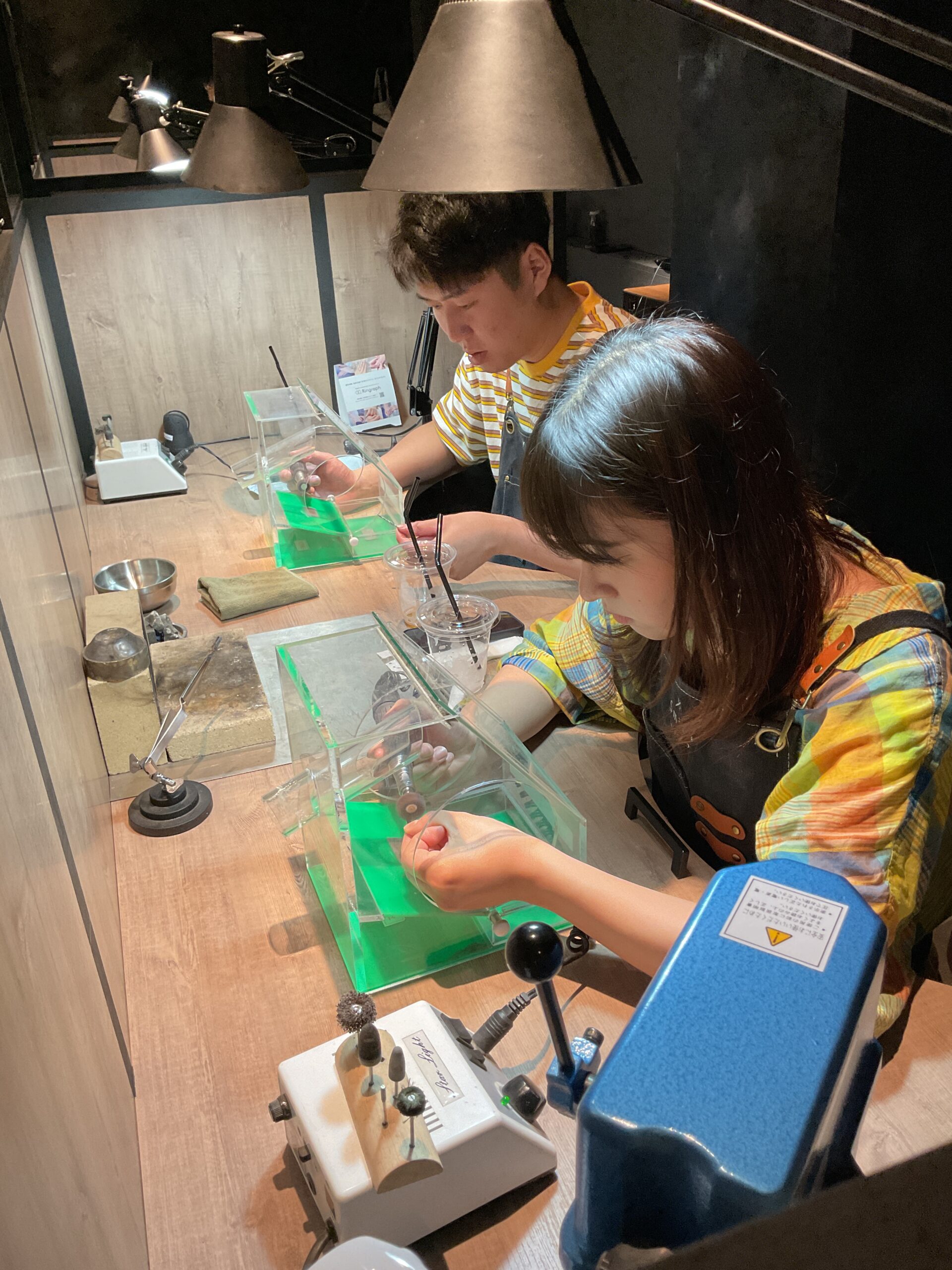 お互いのネックレスに丁寧に模様をつけていただき、他では買うことのできない世界に一つだけのネックレスが完成しました。