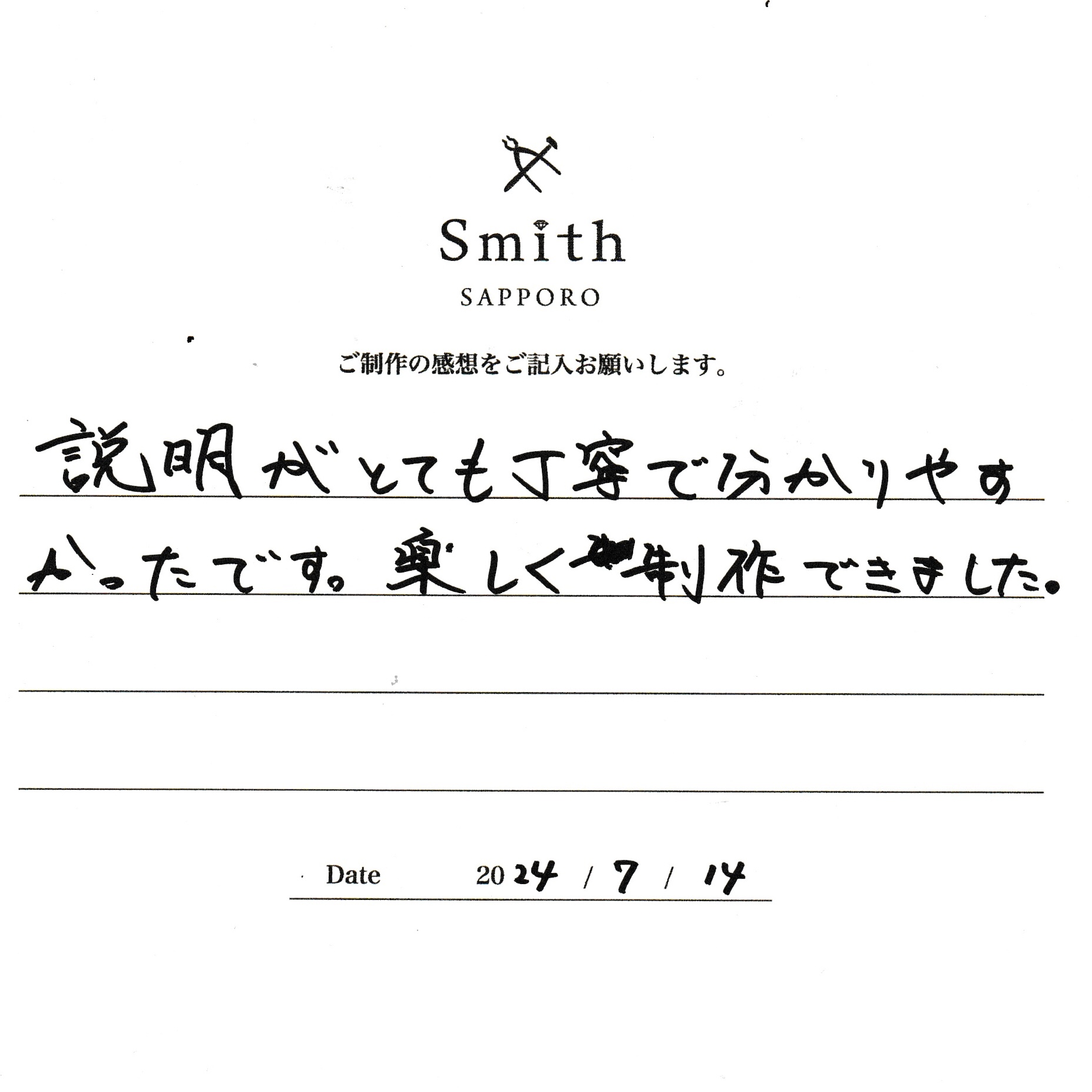 この度は、工房Smith京王プラザホテル札幌店で手作りペアリングのご制作誠にありがとうございました。