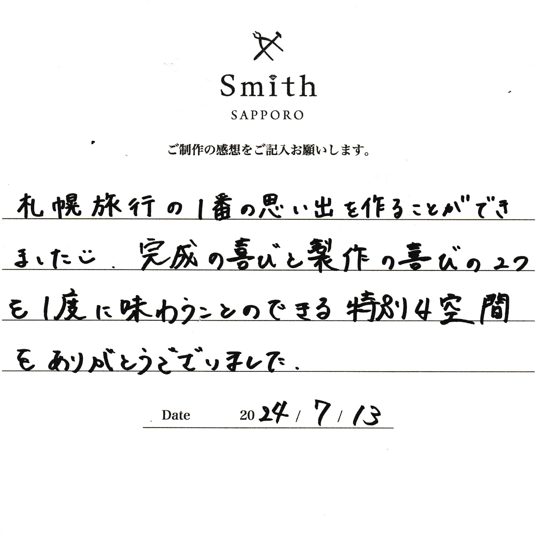 この度は、工房Smith京王プラザホテル札幌店で手作りペアリングのご制作誠にありがとうございました。