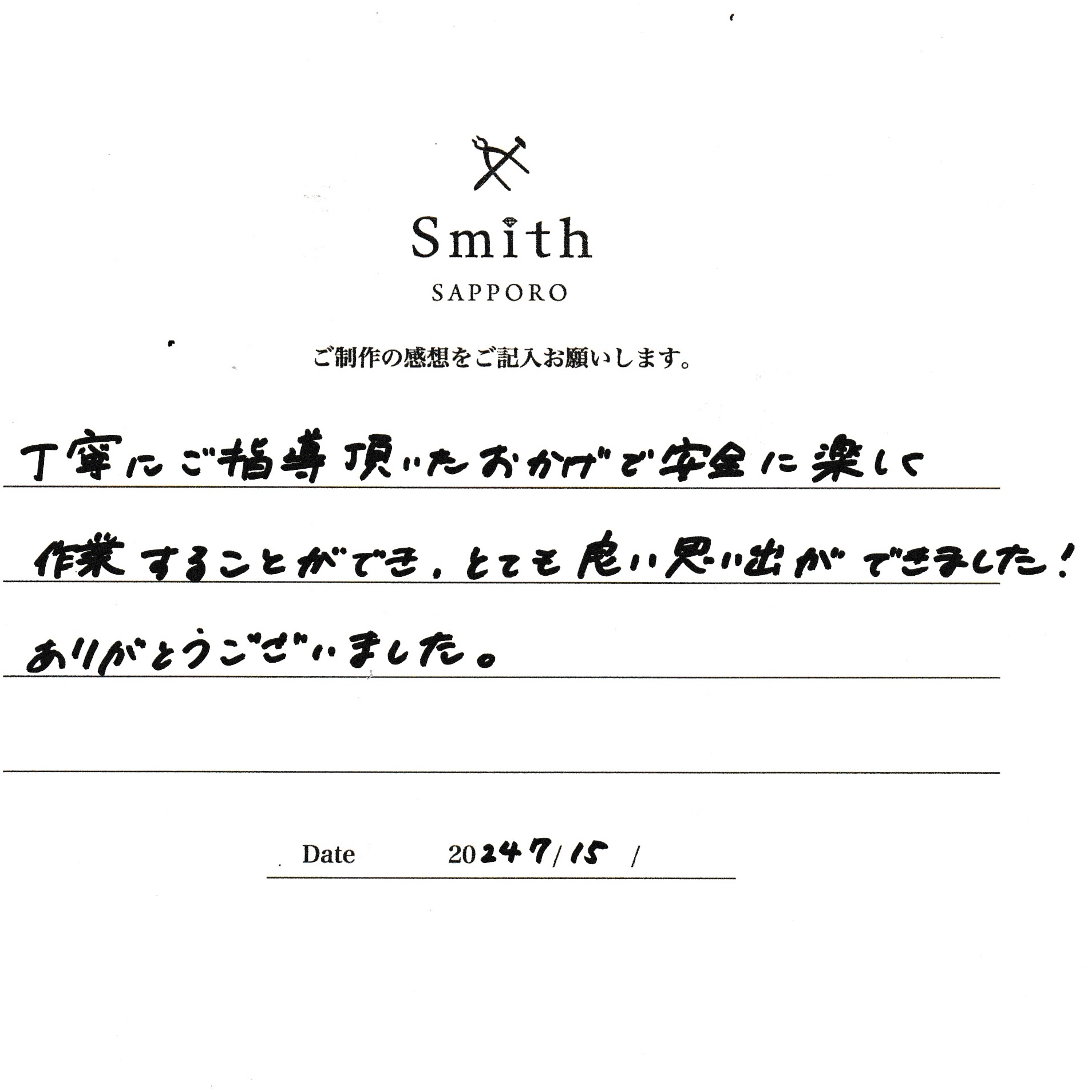 この度は、工房Smith京王プラザホテル札幌店で手作りペアリングのご制作誠にありがとうございました。