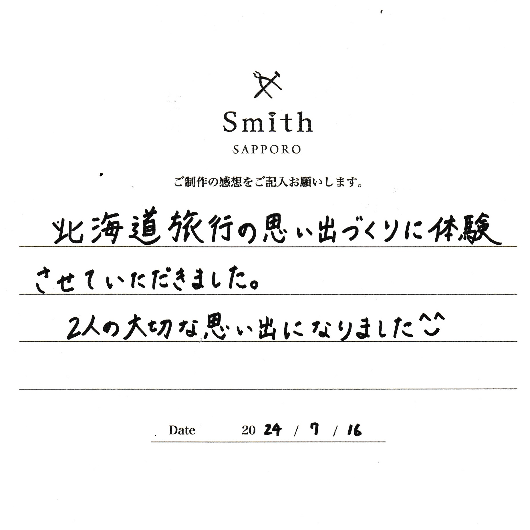 この度は、工房Smith京王プラザホテル札幌店で手作りペアリングのご制作誠にありがとうございました。
