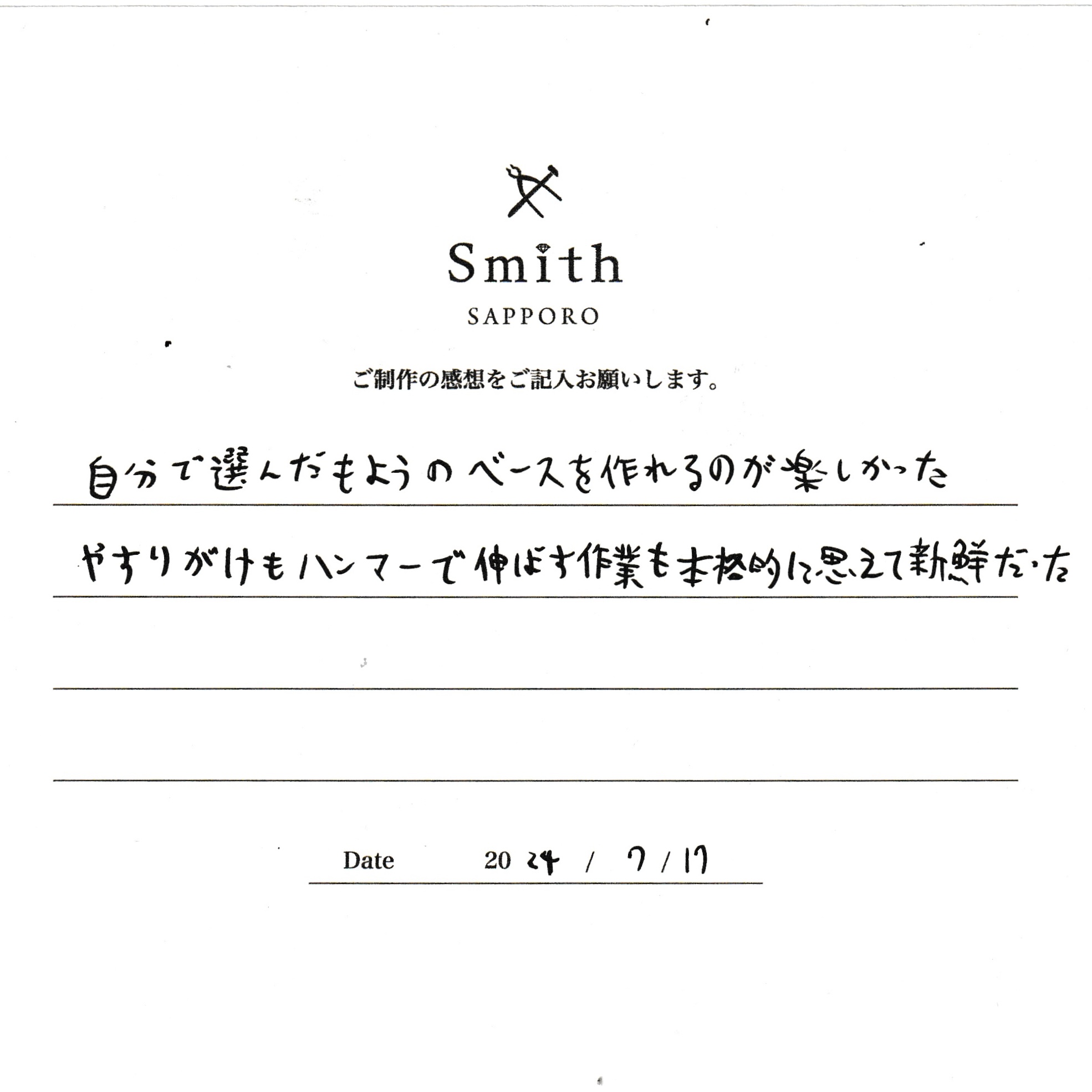 この度は、工房Smith京王プラザホテル札幌店で手作りペアリングのご制作誠にありがとうございました。