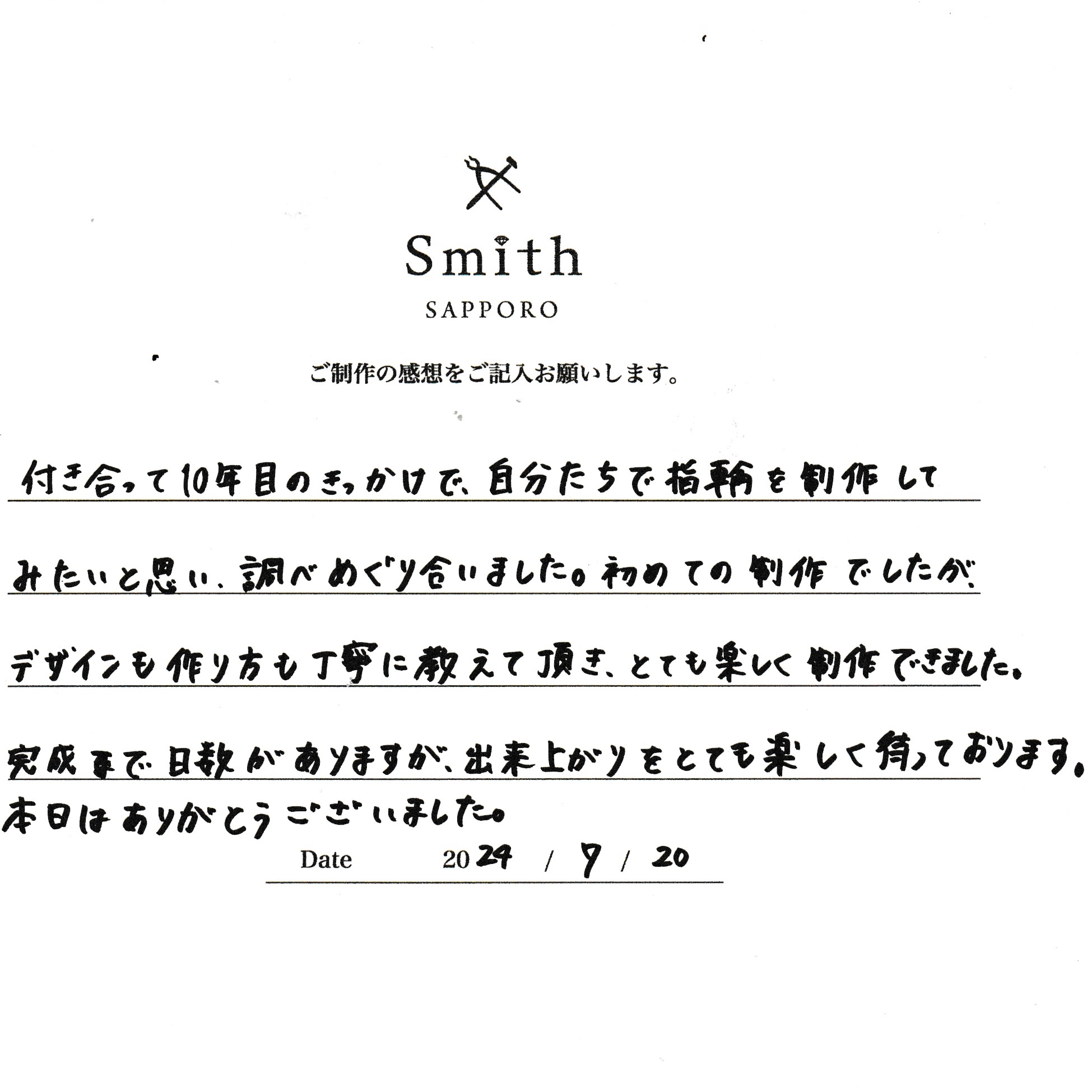 この度は、工房Smith京王プラザホテル札幌店で手作りペアリングのご制作誠にありがとうございました。