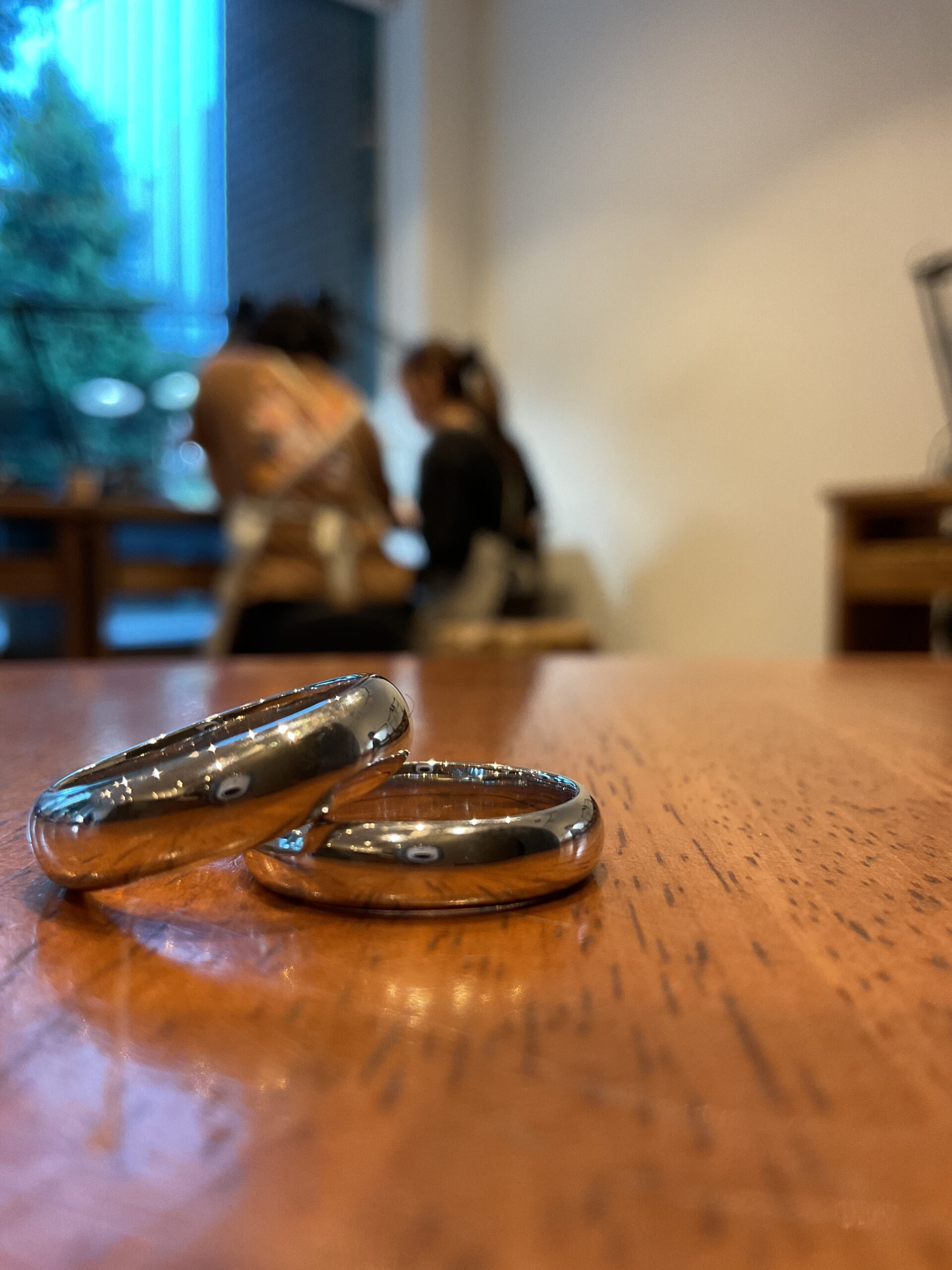 鏡面仕上げのシンプルなリングをシャンパンゴールドカラーにし、内側におふたりの記念日の刻印を入れた、唯一無二のペアリングになりましたね。