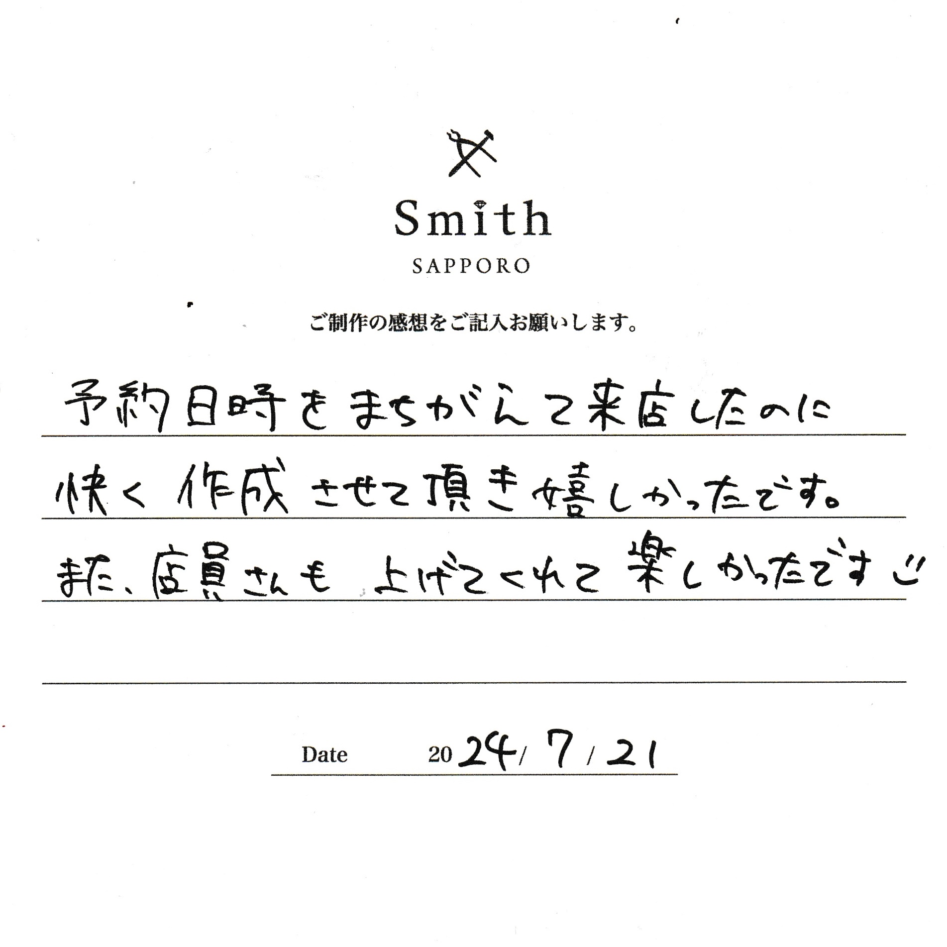 予約日時を間違えて来店したのに快く作成させて頂き嬉しかったです。