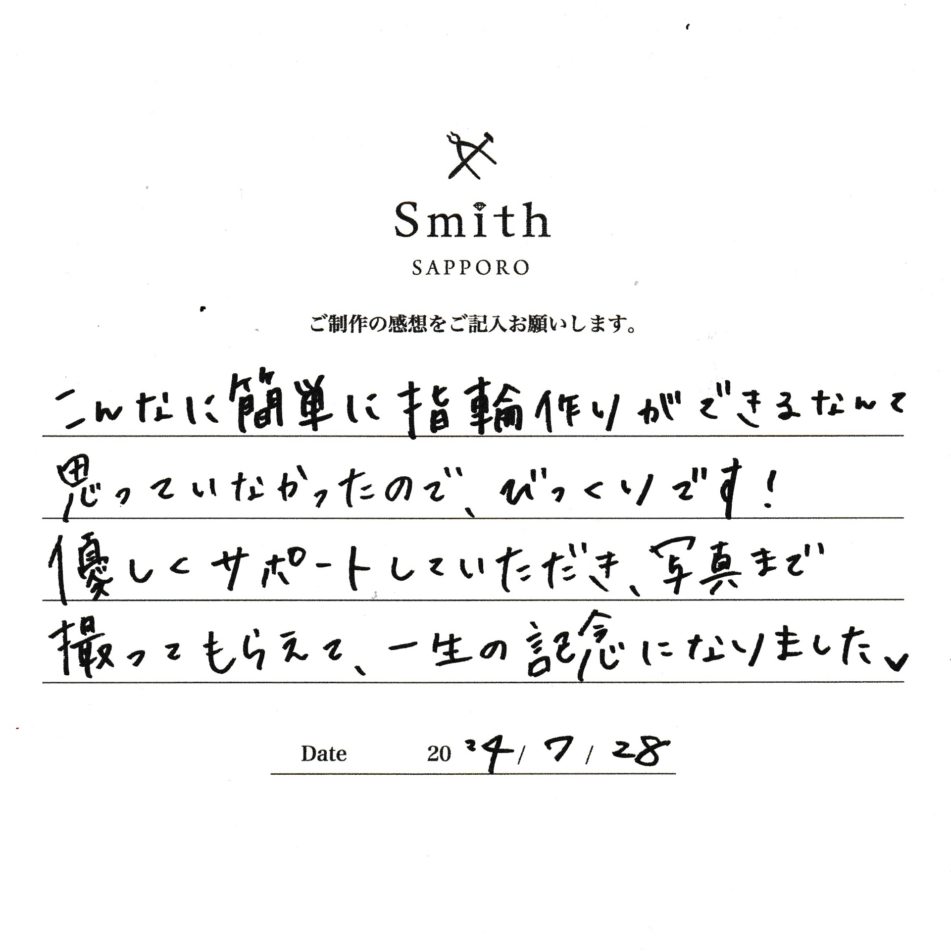 この度は、工房Smith京王プラザホテル札幌店で手作りペアリングのご制作誠にありがとうございました。