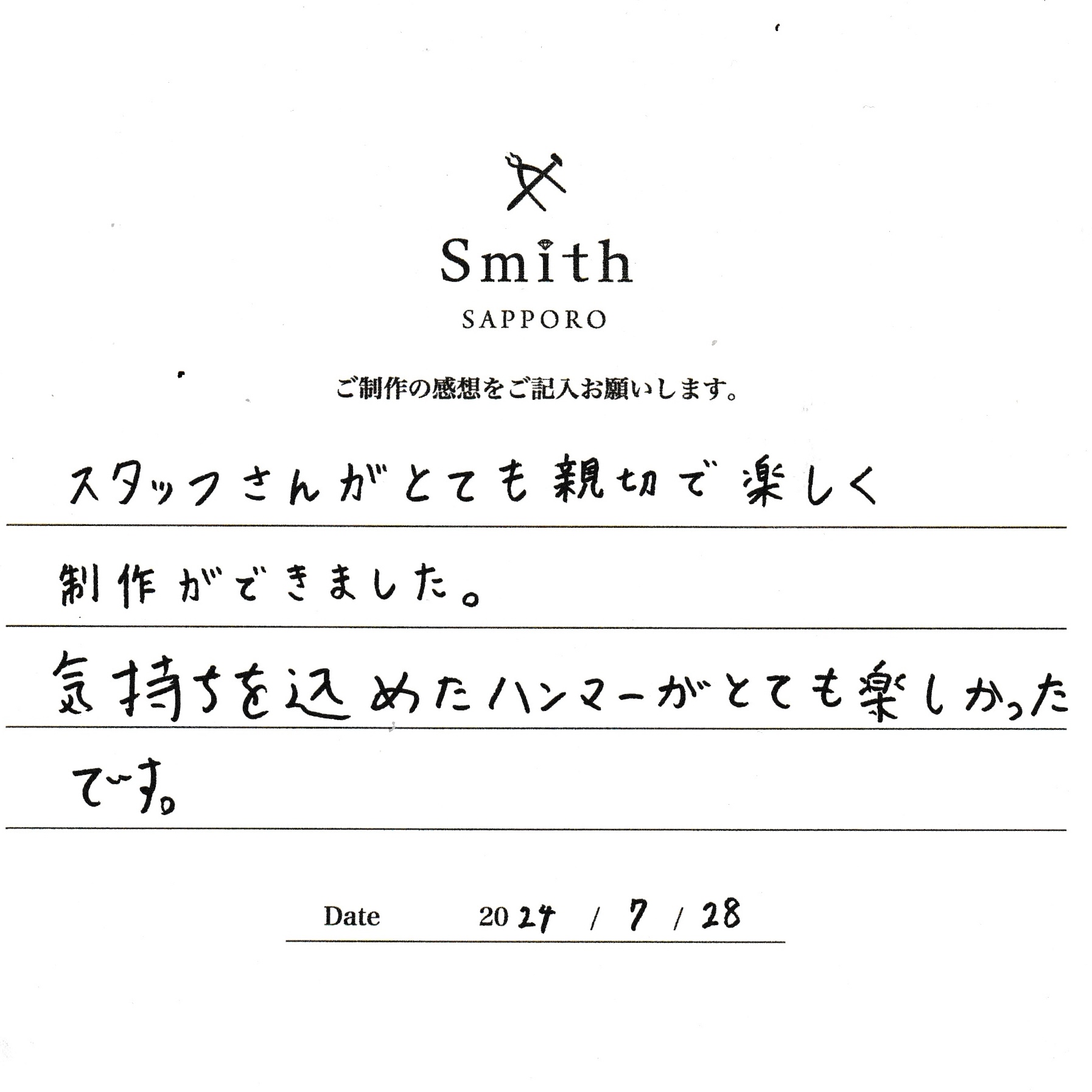 この度は、工房Smith京王プラザホテル札幌店で手作りペアリングのご制作誠にありがとうございました。