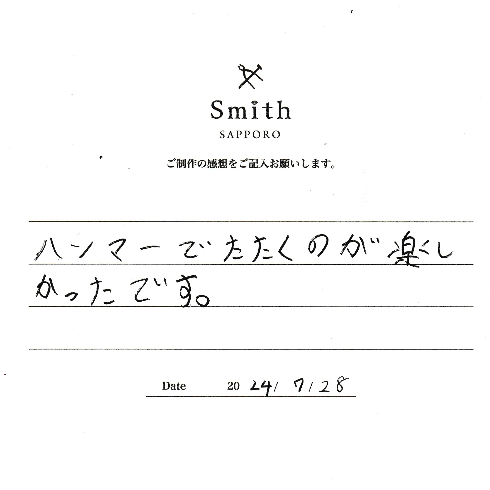 この度は、工房Smith京王プラザホテル札幌店で手作りペアリングのご制作誠にありがとうございました。