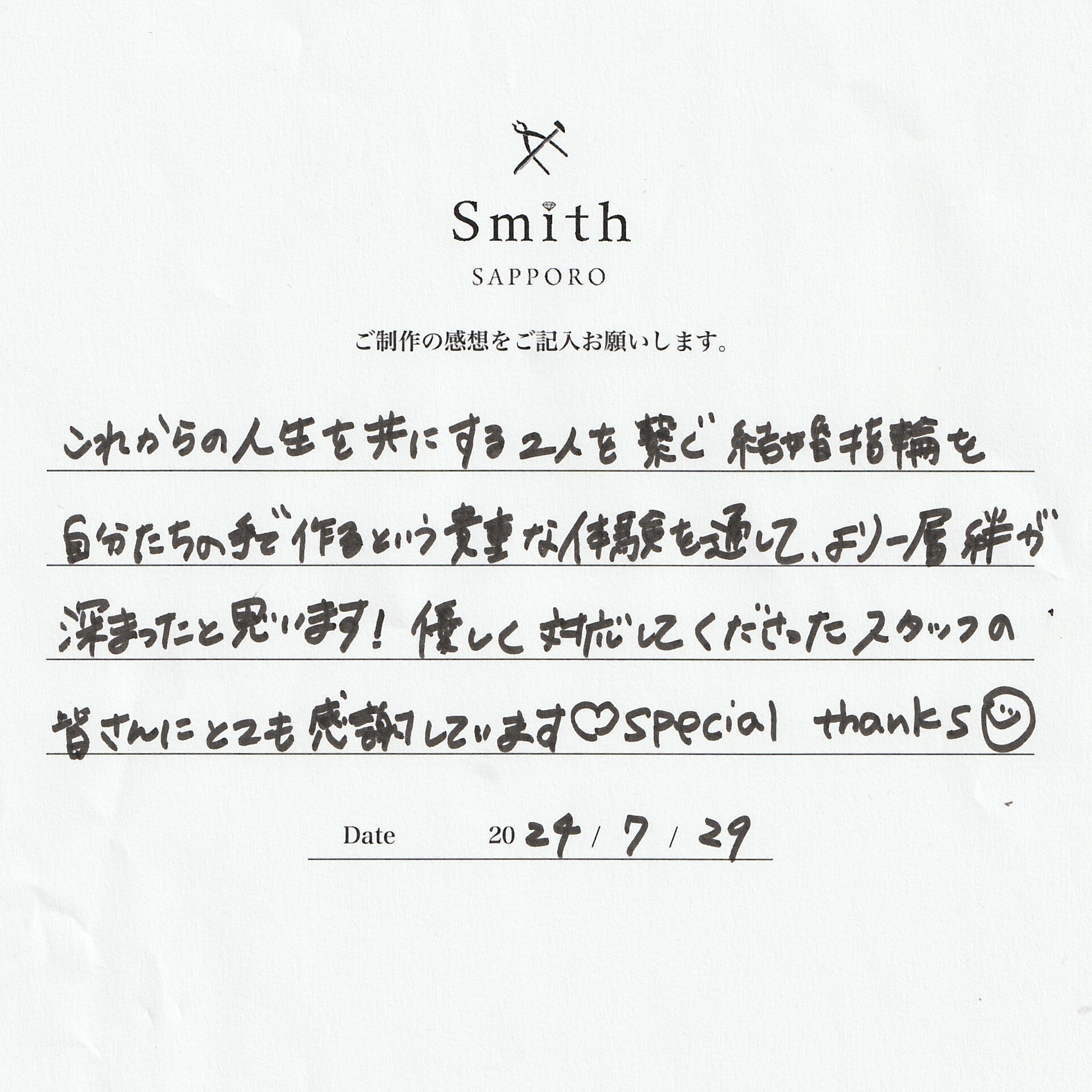 これからの人生を共にする2人を繋ぐ結婚指輪を自分たちの手で作るという貴重な体験を通して、より一層絆が深まったと思います!