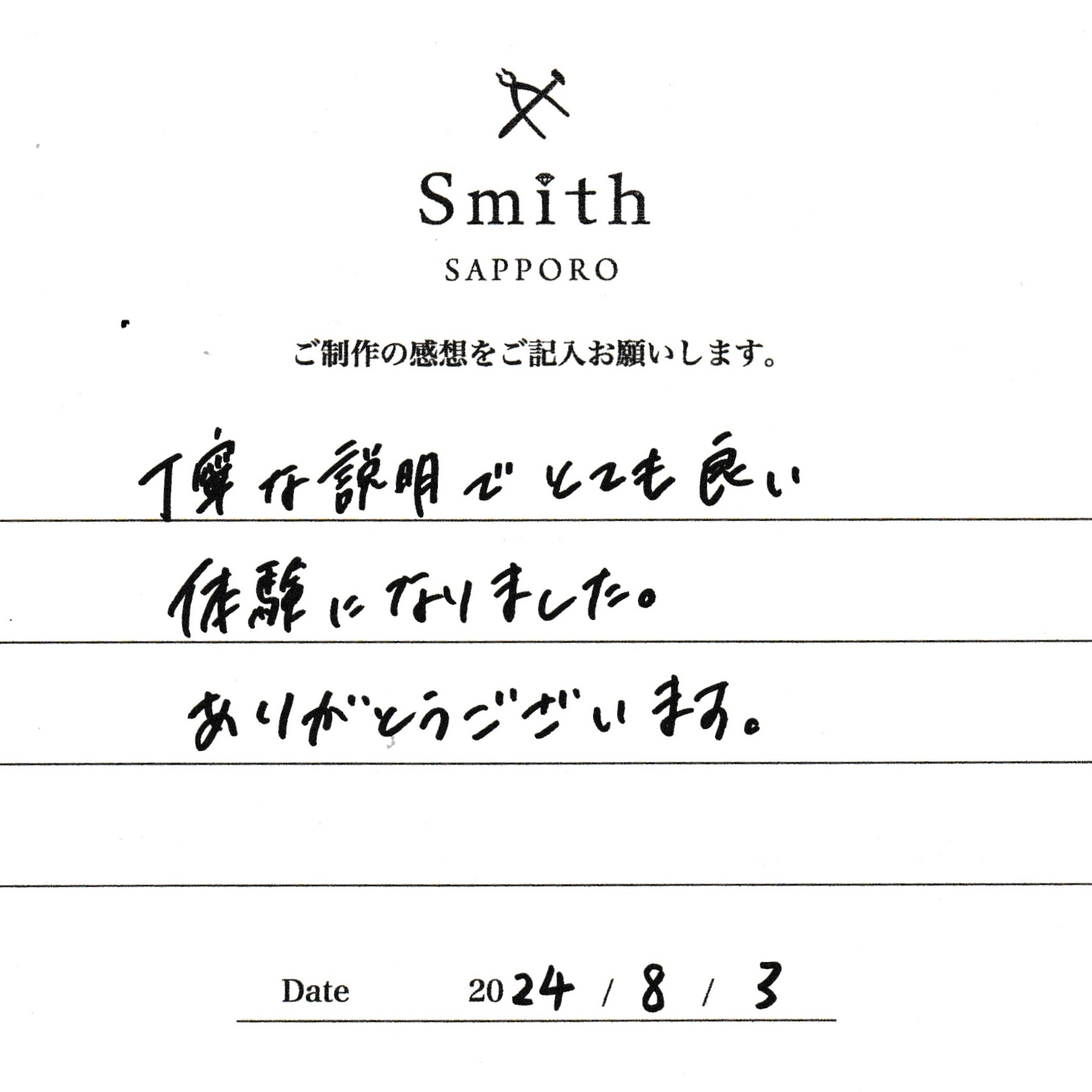 この度は、工房Smith京王プラザホテル札幌店で手作りペアリングのご制作誠にありがとうございました。