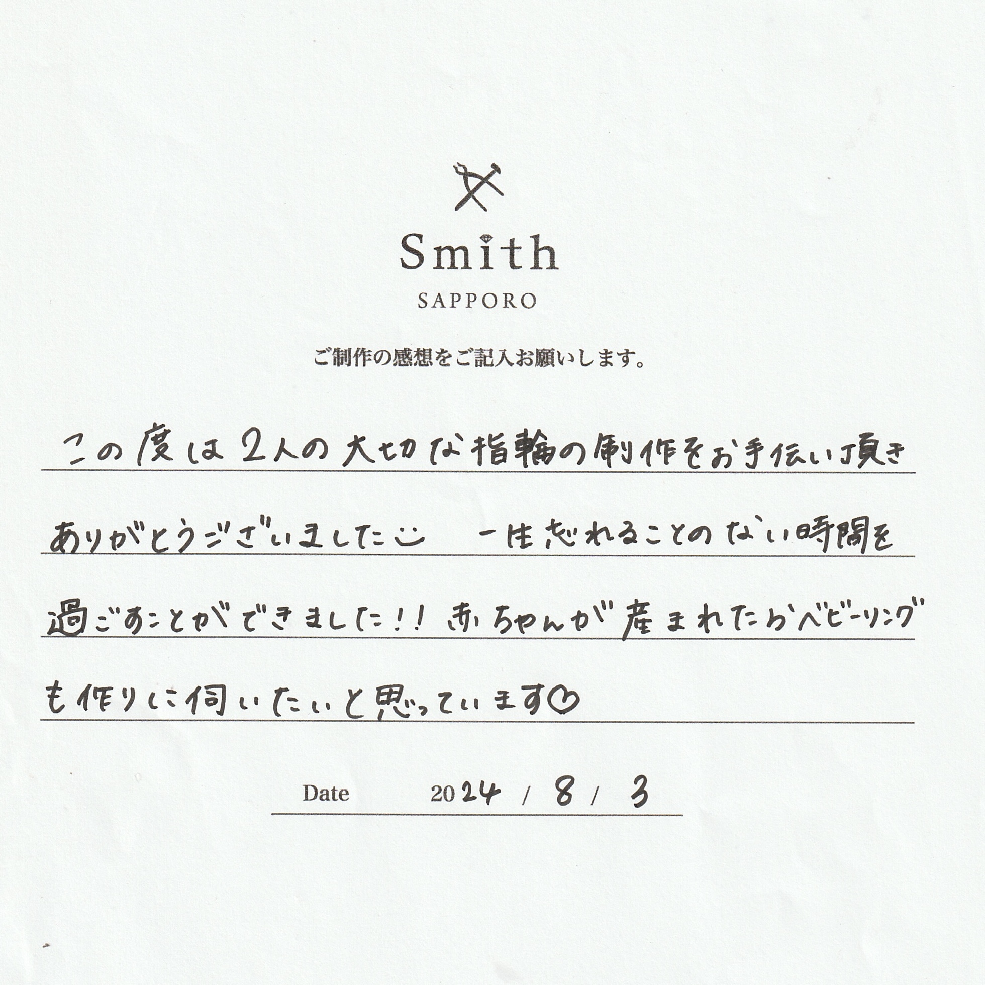 この度は2人の大切な指輪の制作をお手伝い頂きありがとうございました。