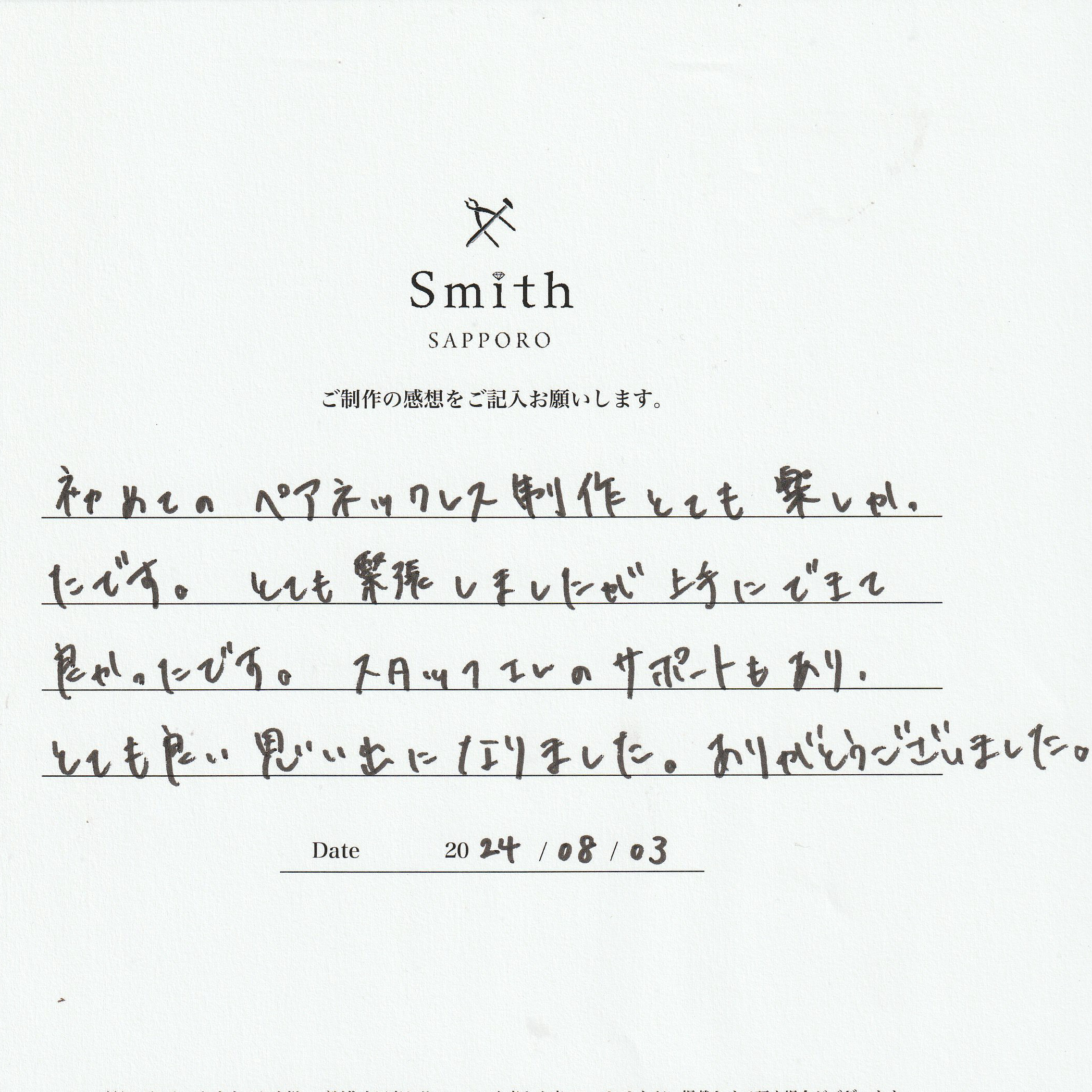 本日は北海道旅行のなか、工房スミス札幌店にてシルバーペアネックレスをご制作いただきまして誠にありがとうございます。