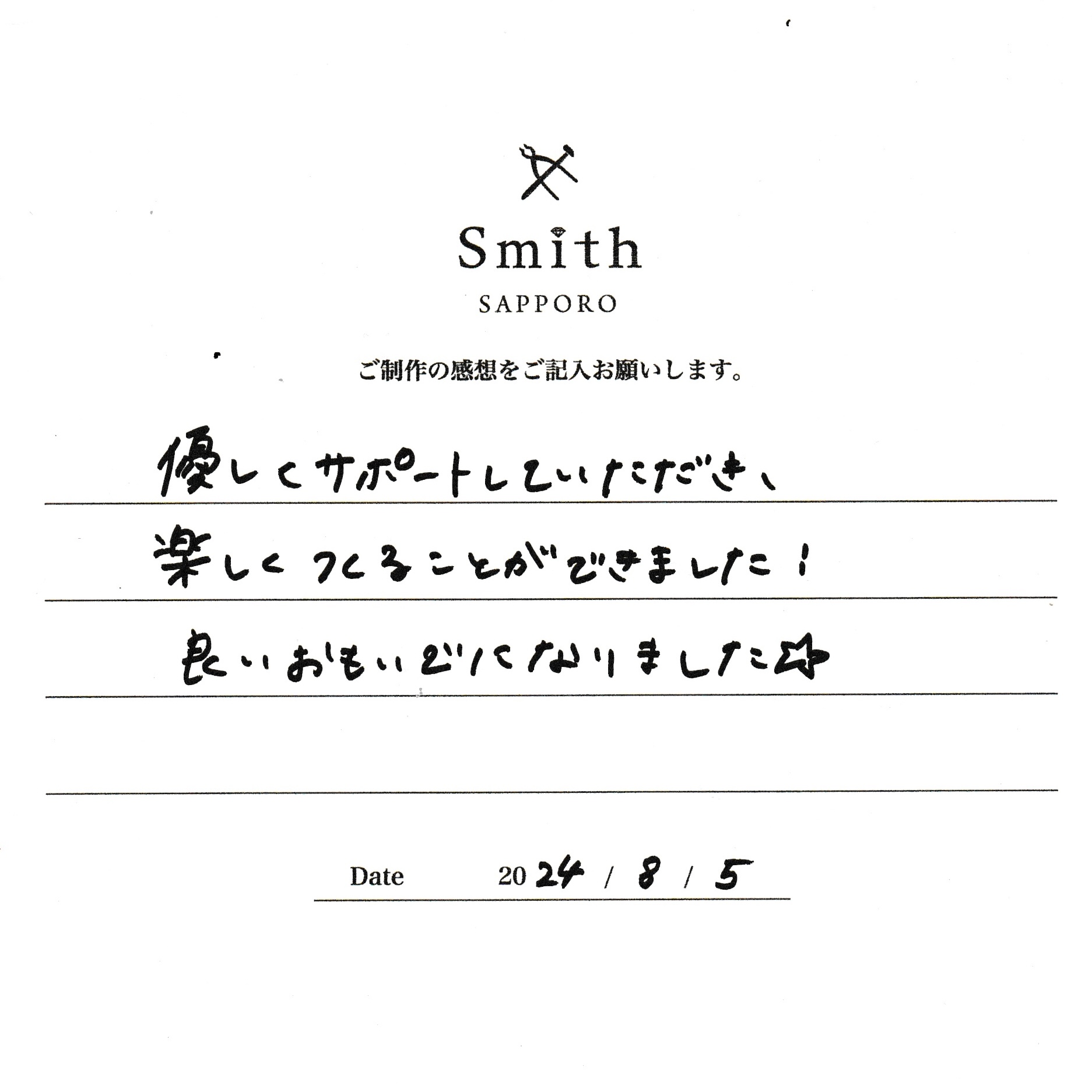 この度は、工房Smith京王プラザホテル札幌店で手作りペアリングのご制作誠にありがとうございました。