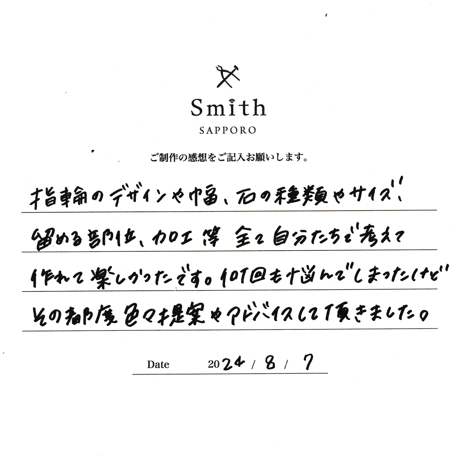 この度は、工房Smith京王プラザホテル札幌店で手作りペアリングのご制作誠にありがとうございました。