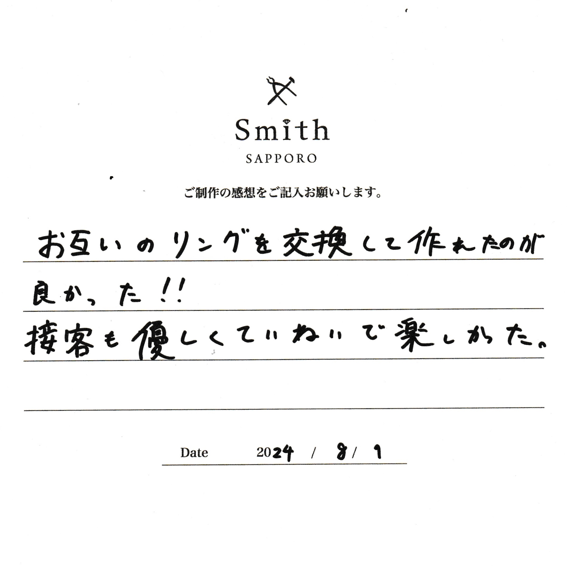 この度は、工房Smith京王プラザホテル札幌店で手作りペアリングのご制作誠にありがとうございました。